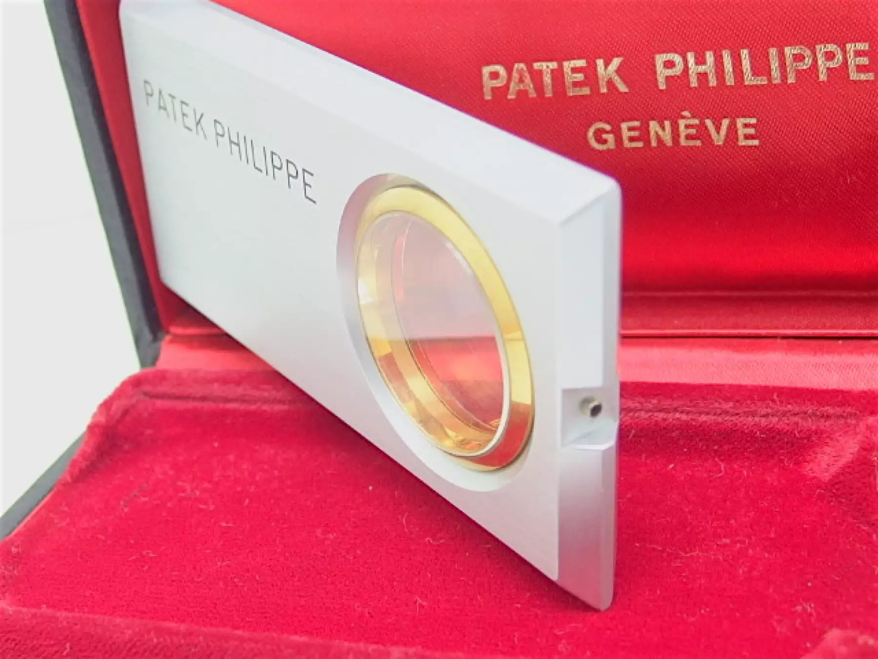 Very rare Patek Philippe movement presentation case with the reference 55 from ca. 1966 for the "Amagnetic" caliber 27 AM-400. Dimensions of 100 x 50 x 8.5 mm with stamped serial number and the original box! An absolute collector's rarity in a very good condition! Price includes 19% VAT! This item is directly available.