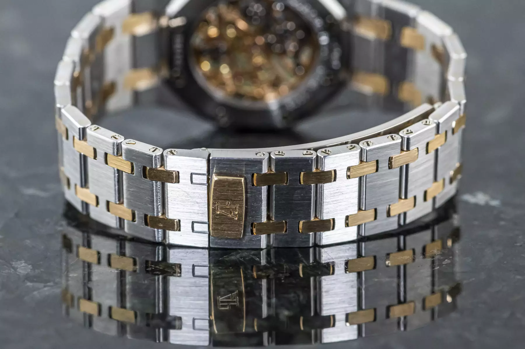 Very rare Audemars Piguet Royal Oak medium Skeleton with the reference 14794PR/O/O902PR/99 in 950 platinum & 18k rose gold and the bracelet also in 950 platinum & 18k rose gold. The diameter is 31 mm and the watch is in very good and unpolished condition. According to our research, only two examples of this reference were produced in this version.