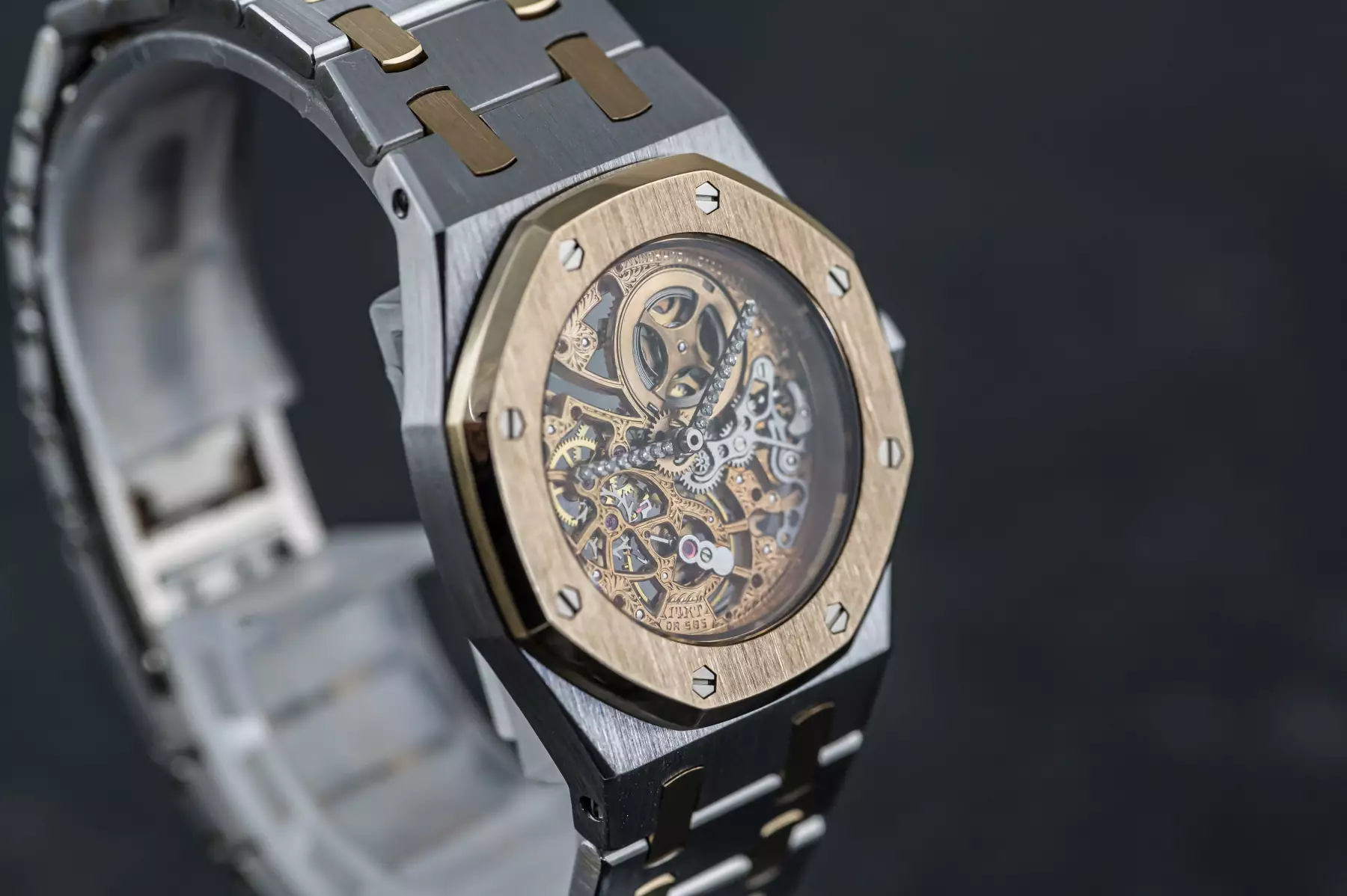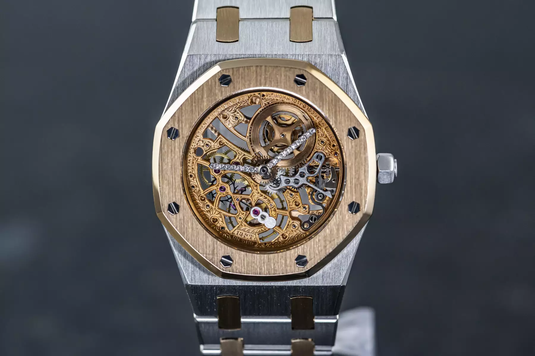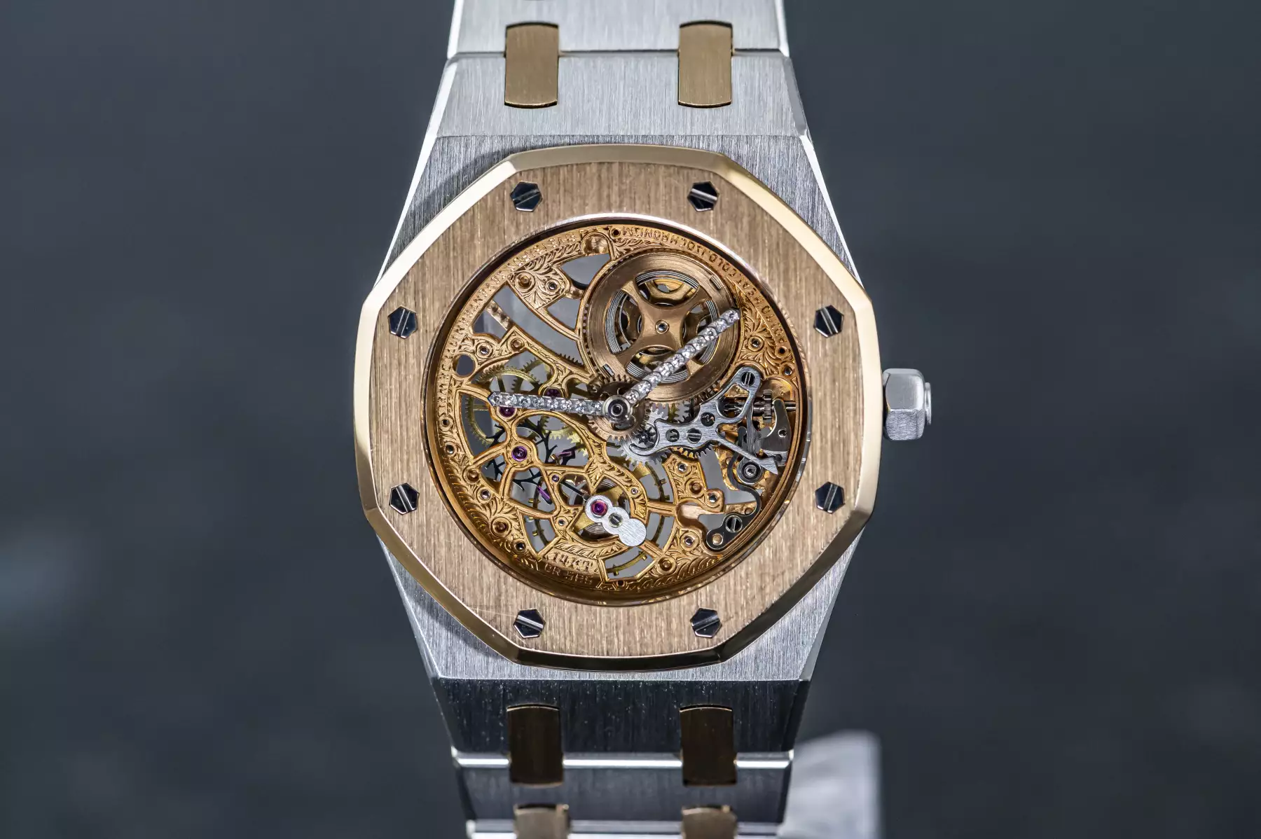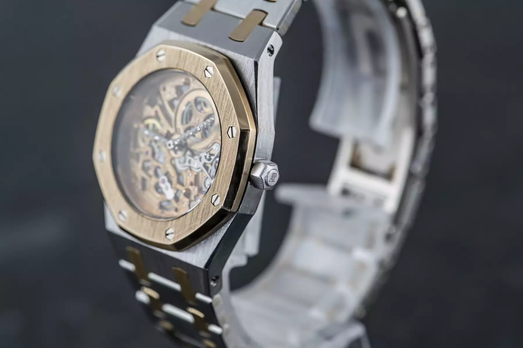 You can see the beautiful AP hand-wound caliber 2003 skeletonised in 14k gold, with the hour and minute hands set with diamonds. This beautiful Royal Oak also comes with the AP service box - guarantee book / certificate - AP service card - AP service invoice from 2021 (a revision was carried out at AP in October 2021 - only the movement / no refurbishment).