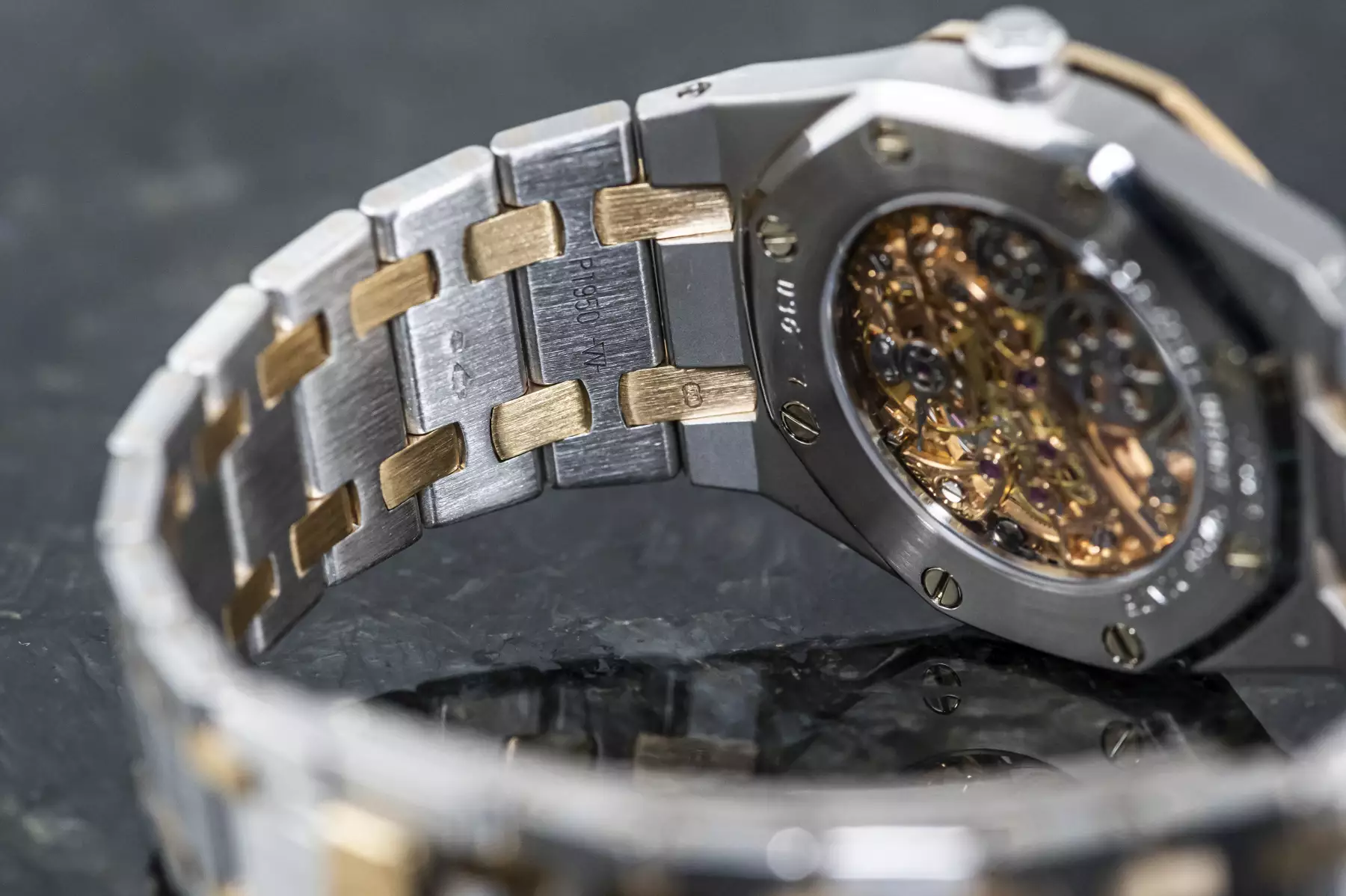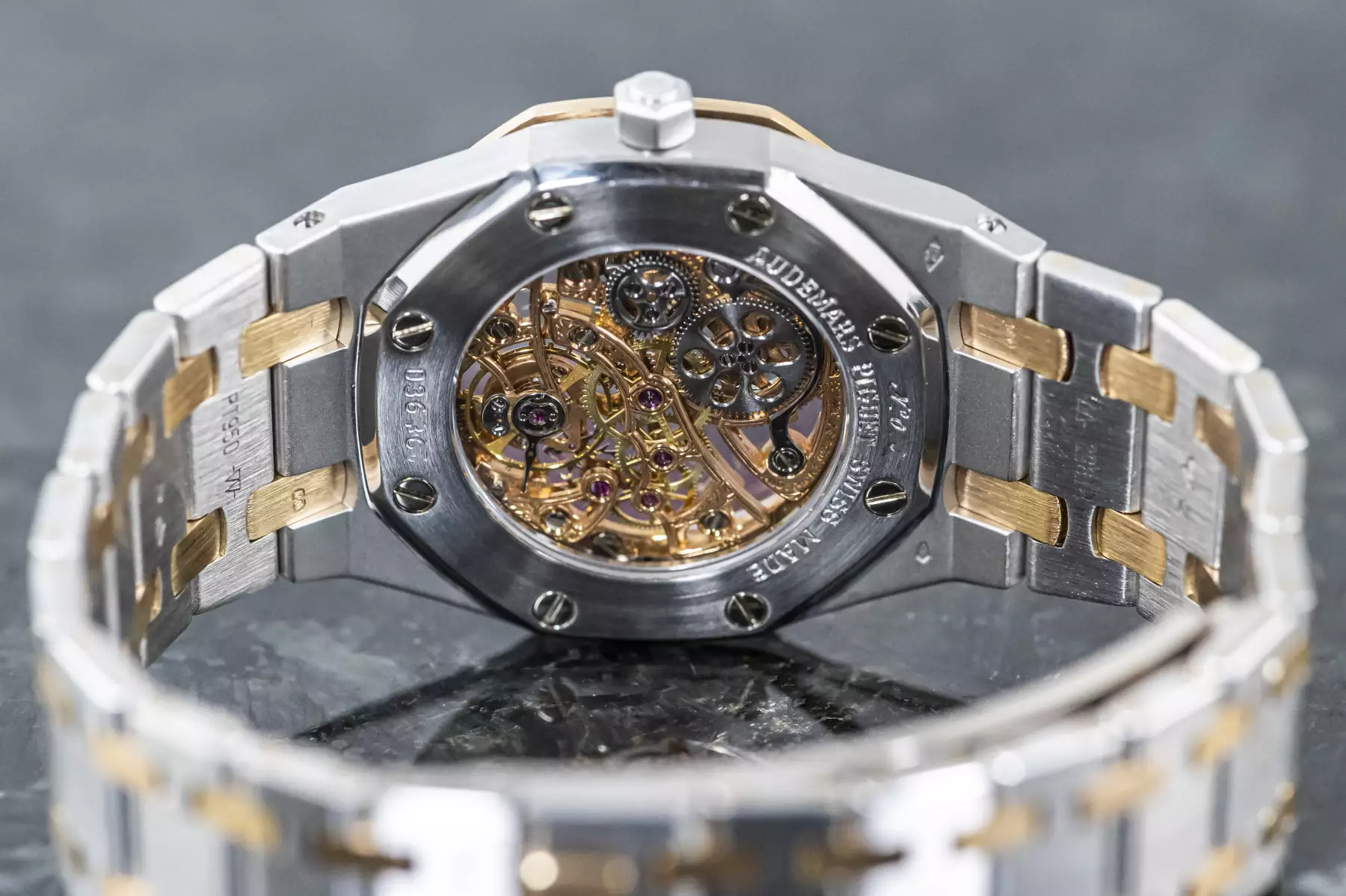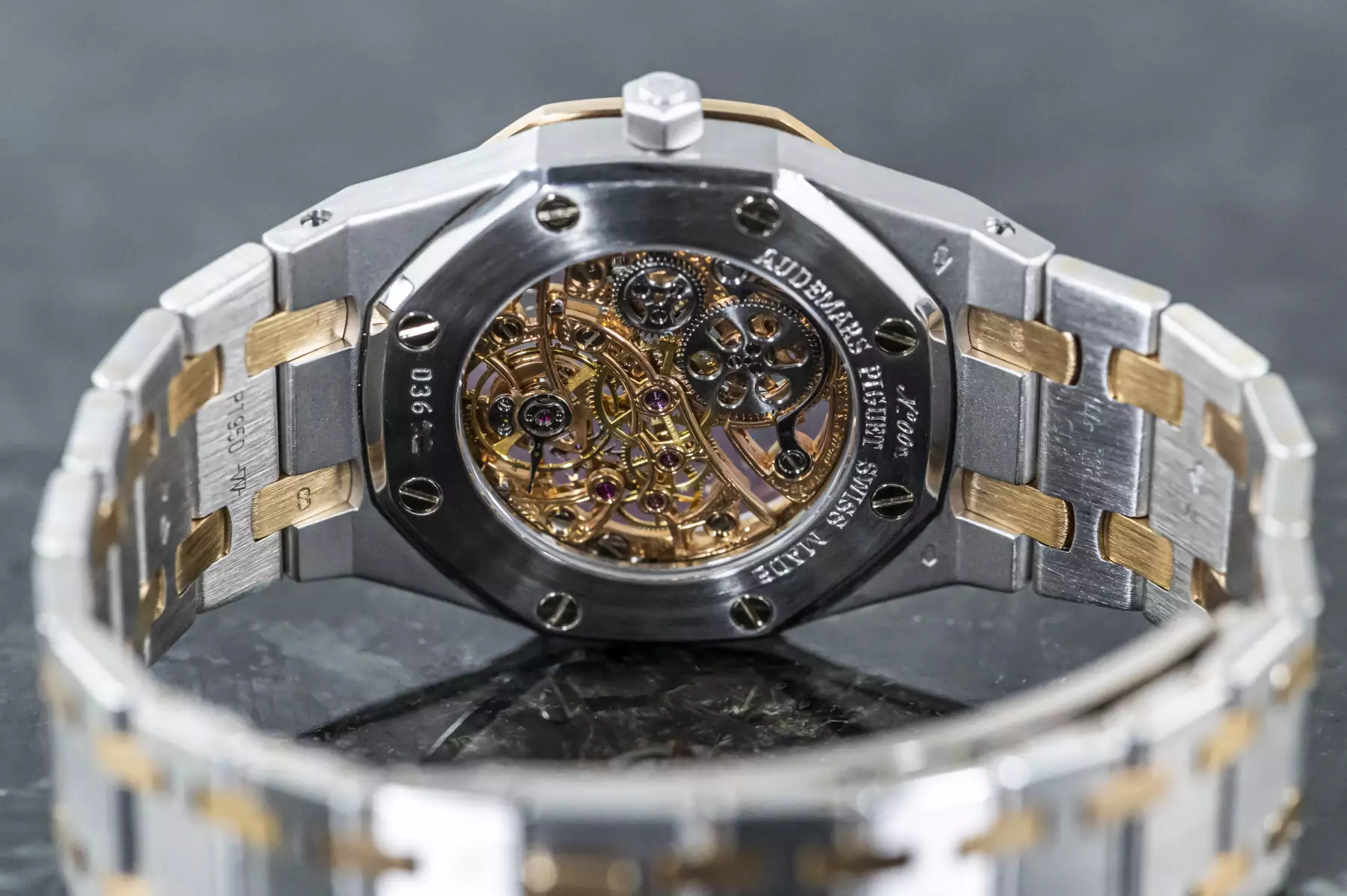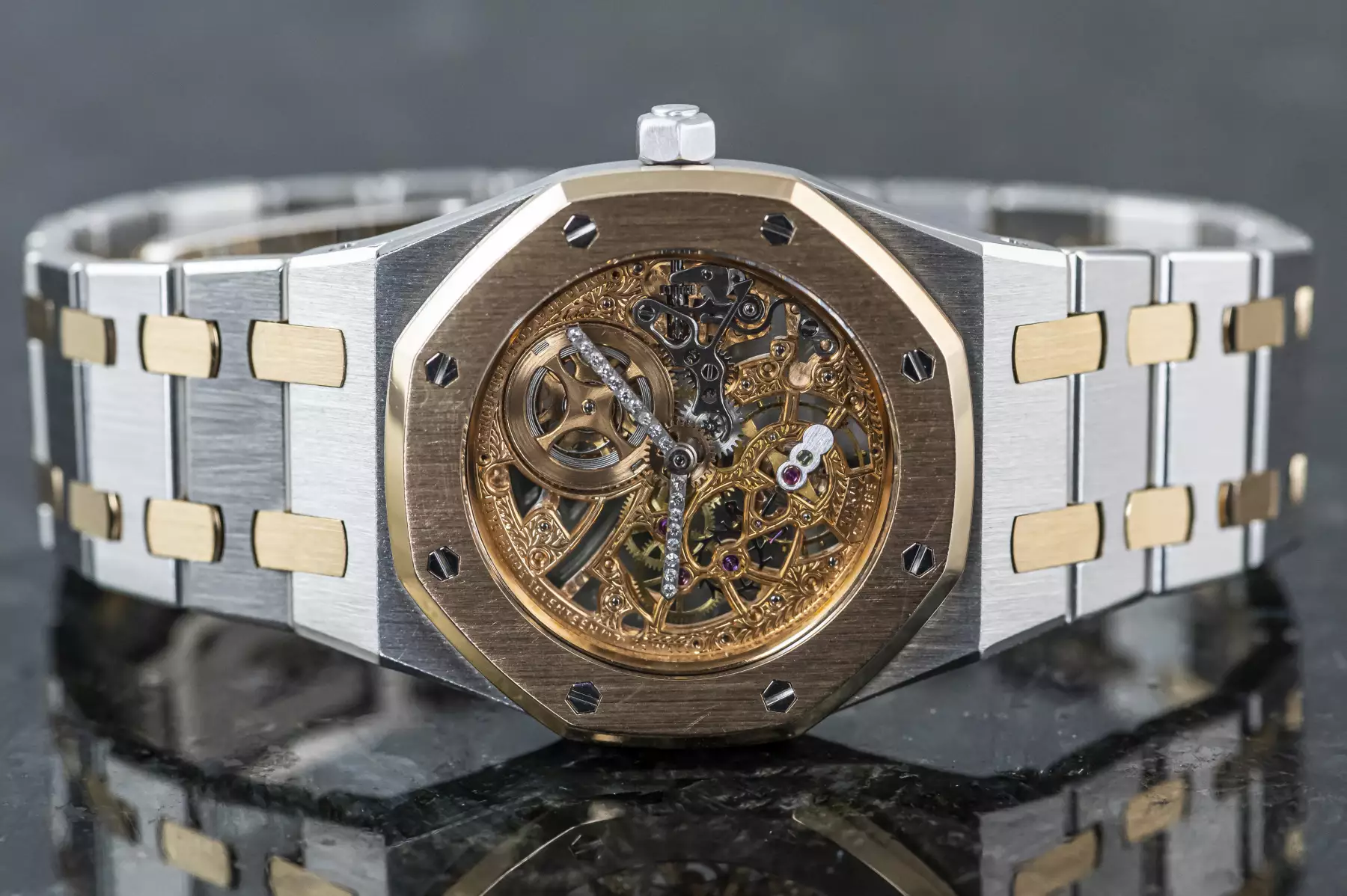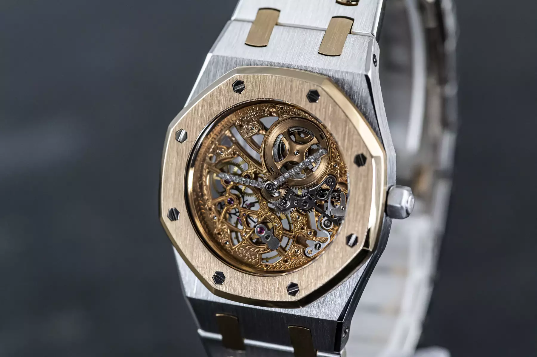 You can see the beautiful AP hand-wound caliber 2003 skeletonised in 14k gold, with the hour and minute hands set with diamonds. This beautiful Royal Oak also comes with the AP service box - guarantee book / certificate - AP service card - AP service invoice from 2021 (a revision was carried out at AP in October 2021 - only the movement / no refurbishment).