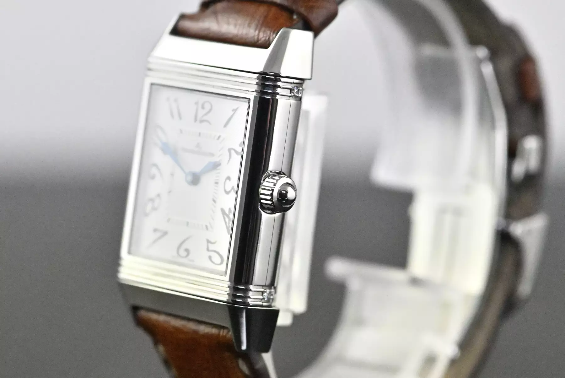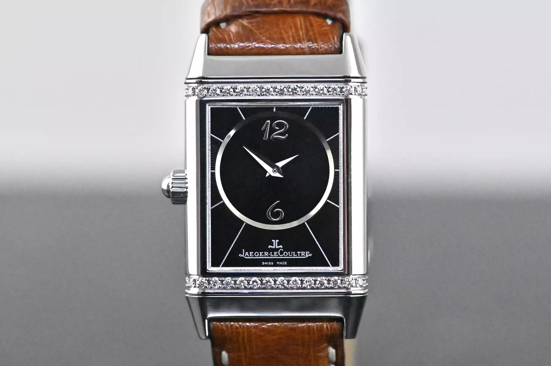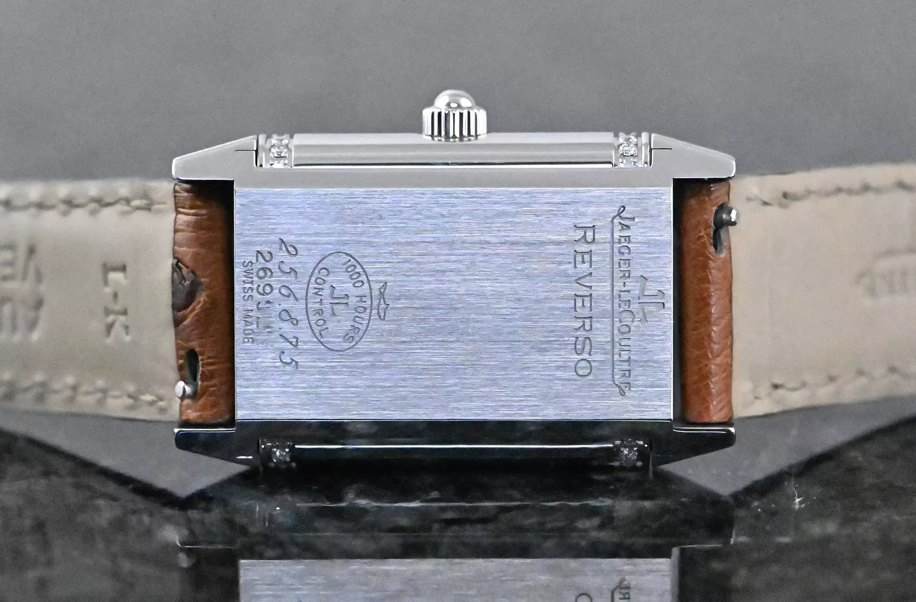 Classic Jaeger-LeCoultre Reverso Duetto Duo ‘Diamond’ with reference 256.8.75 - Q2568402 in steel. One side of the 180° reversible Reverso case is set with original JLC diamonds. This Reverso is on a JLC leather strap with original JLC double folding clasp in steel.