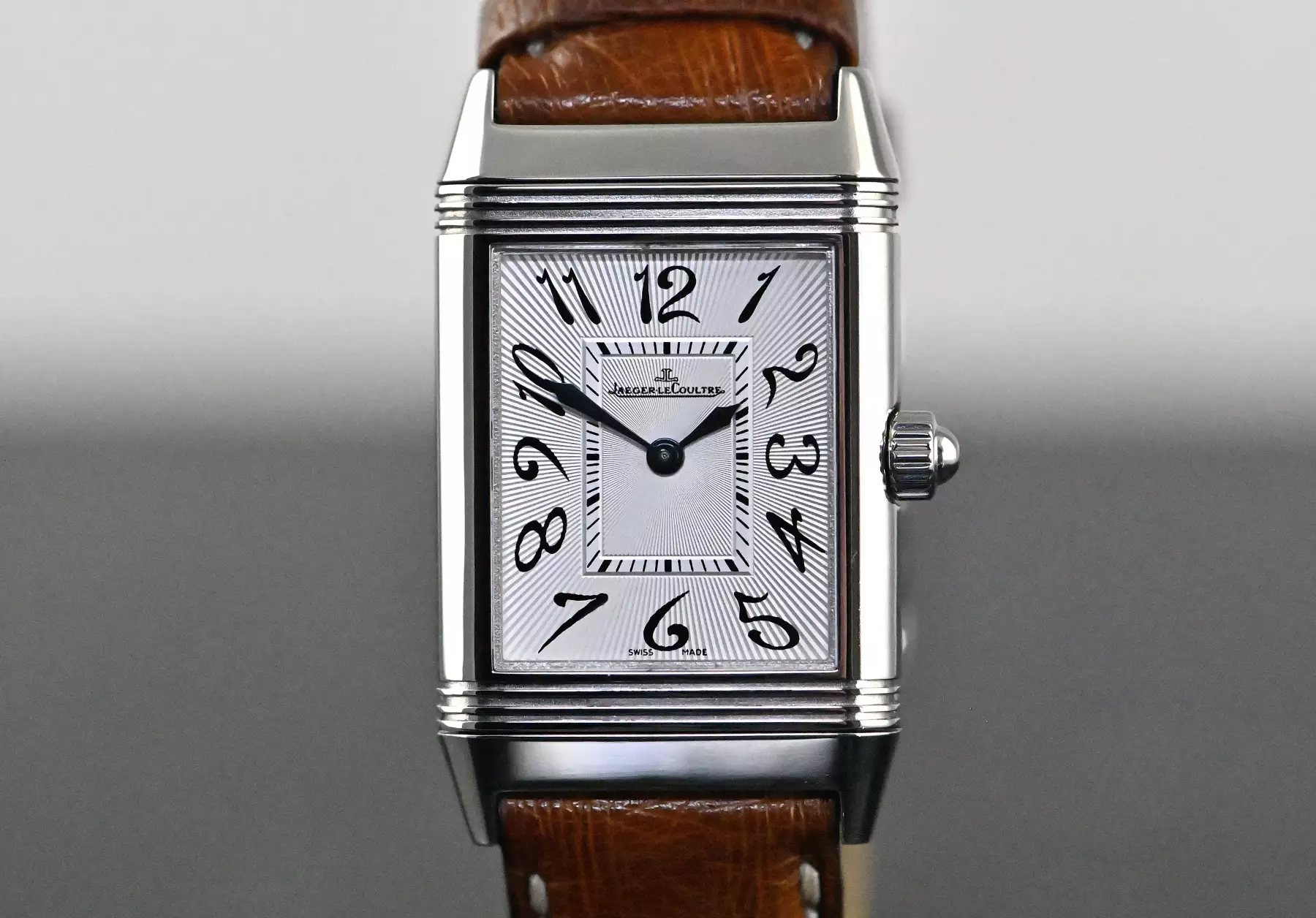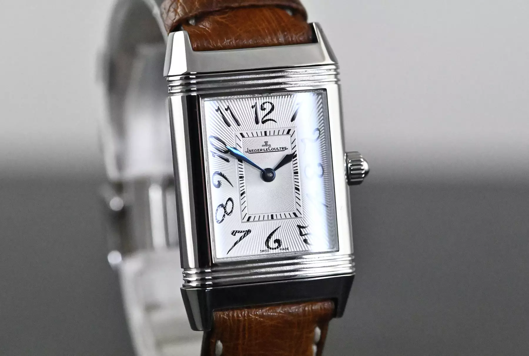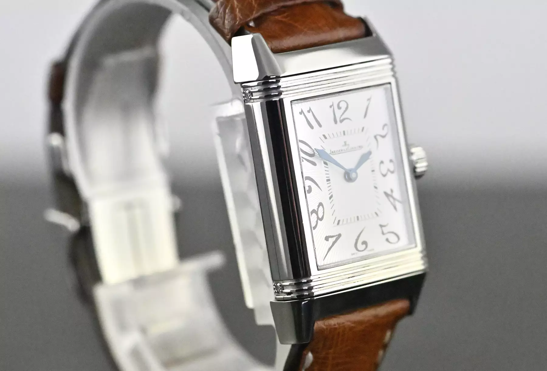 Classic Jaeger-LeCoultre Reverso Duetto Duo ‘Diamond’ with reference 256.8.75 - Q2568402 in steel. One side of the 180° reversible Reverso case is set with original JLC diamonds. This Reverso is on a JLC leather strap with original JLC double folding clasp in steel.
