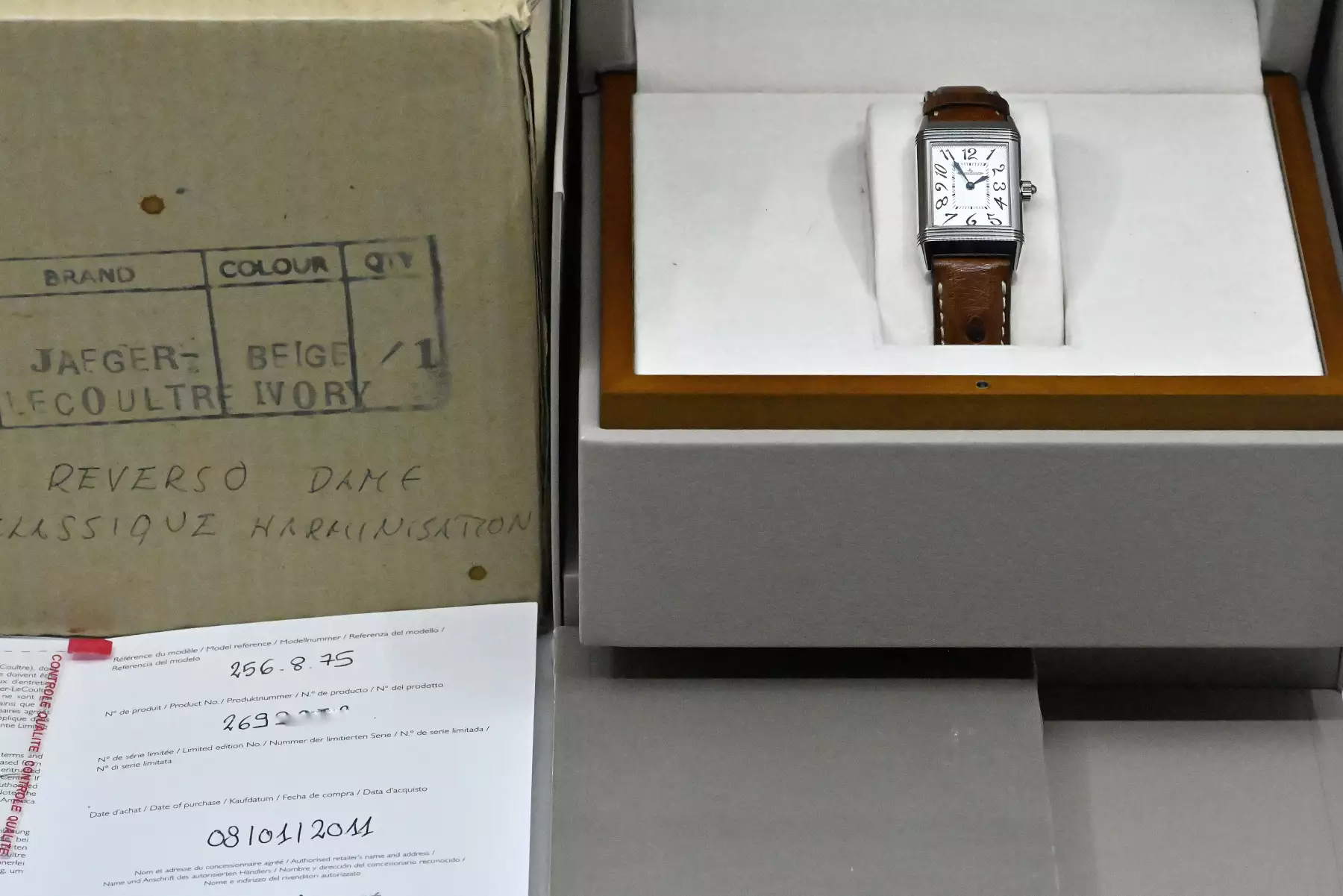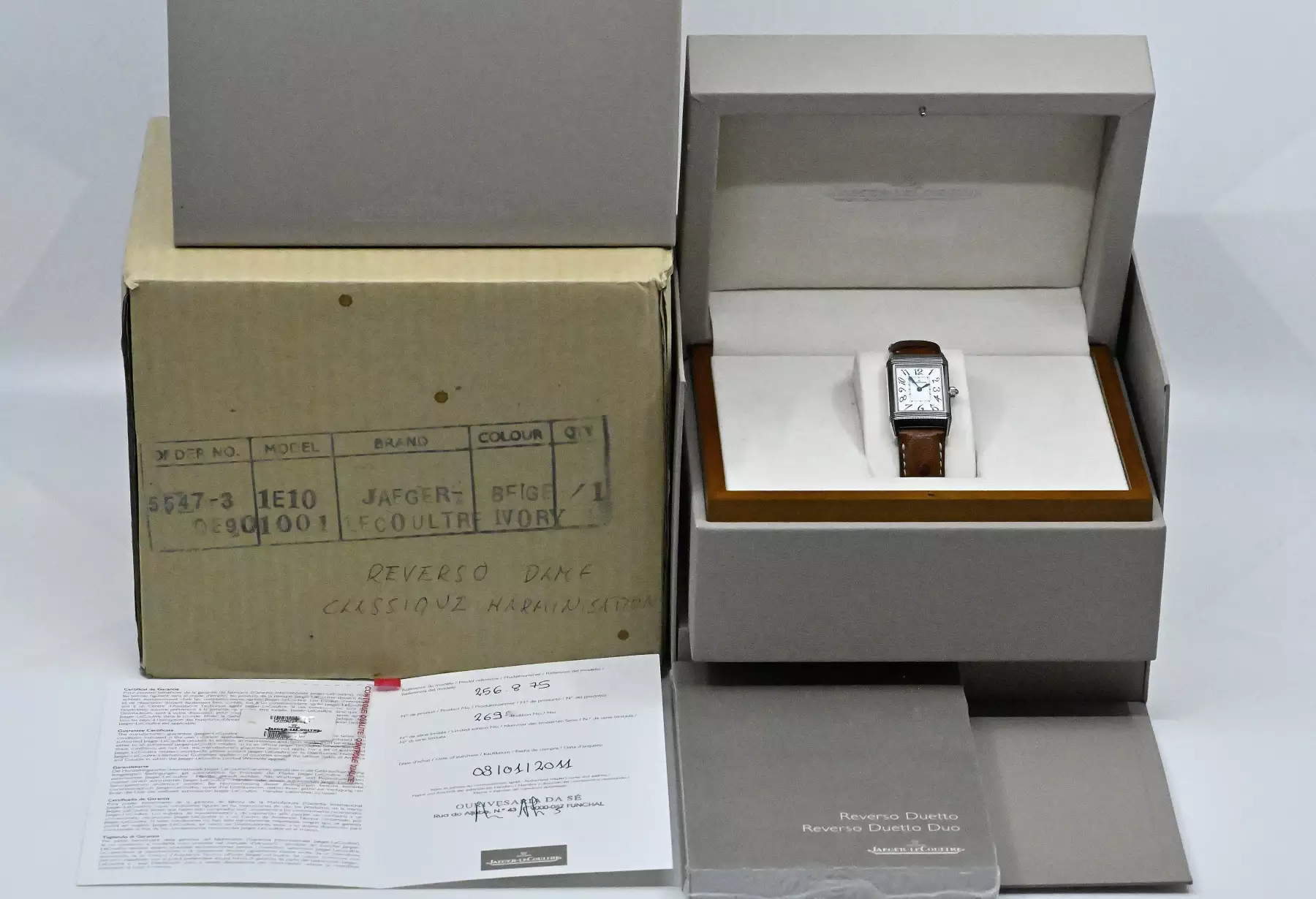 The watch is in good condition, the dimensions of the case are 24 x 40 mm. In November 2025, our master watchmaker performed a service. The offered Reverso Duetto offer is delivered in a full set with triple packaging: original JLC box with outer carton and cardboard carton – warranty certificate (sold in January 2011) – Reverso description/booklet – sticker.