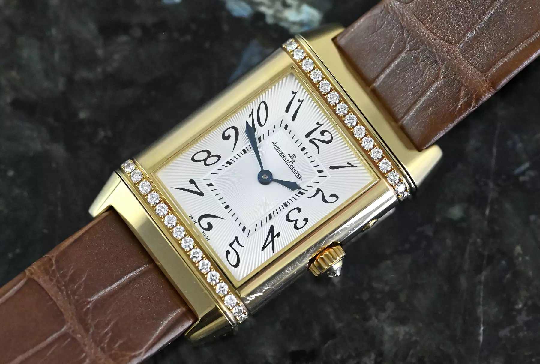Elegant and stylish Jaeger-LeCoultre Reverso Duetto Duo ‘Diamond’ with reference 269.1.54 - Q2691420 in 18k yellow gold. Both sides of the 180° reversible JLC Reverso case are set with original JLC diamonds (a total of 64 diamonds on the front and back with approx. 1 carat), giving the watch a magnificent appearance.