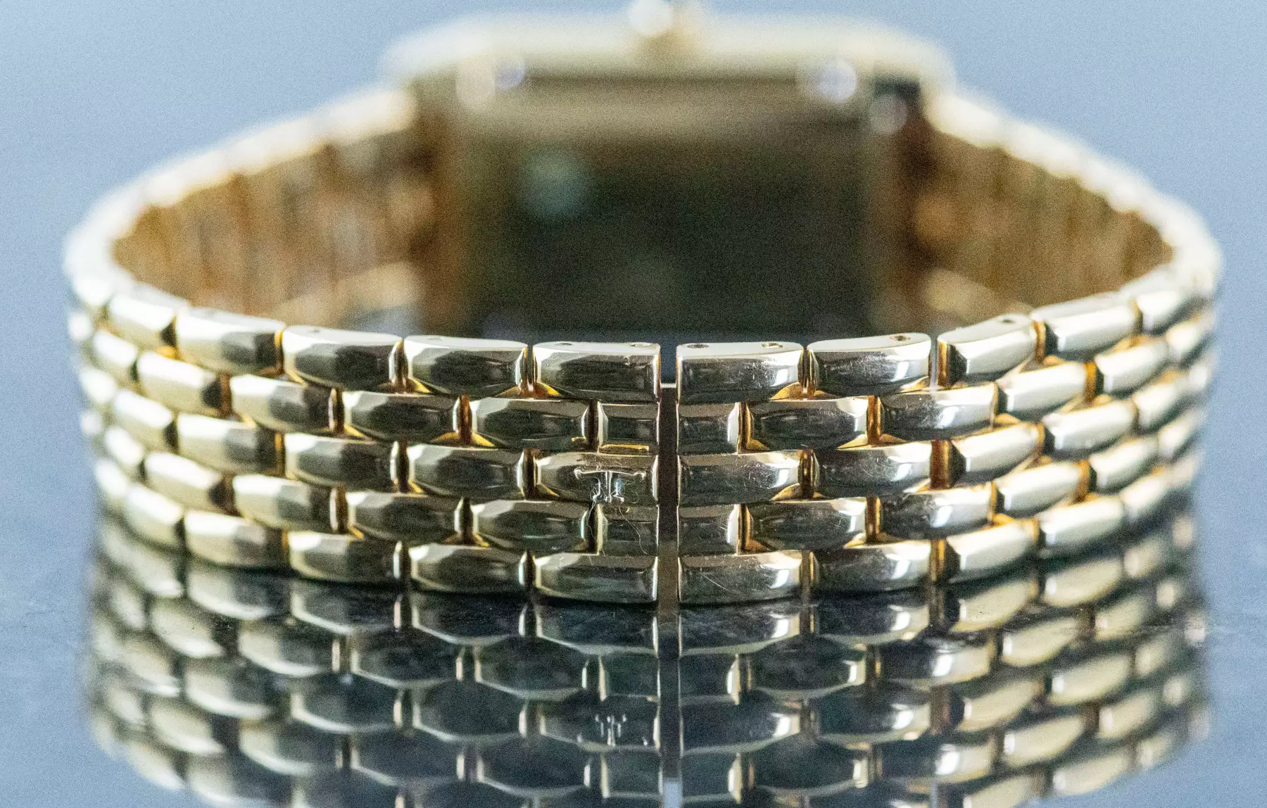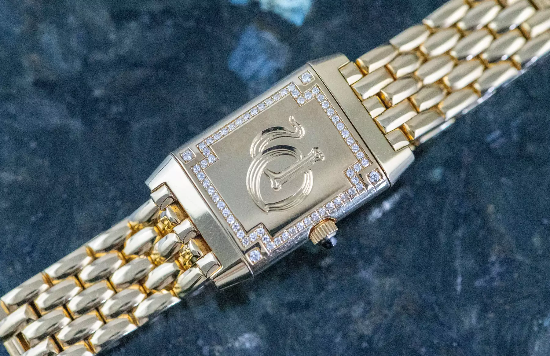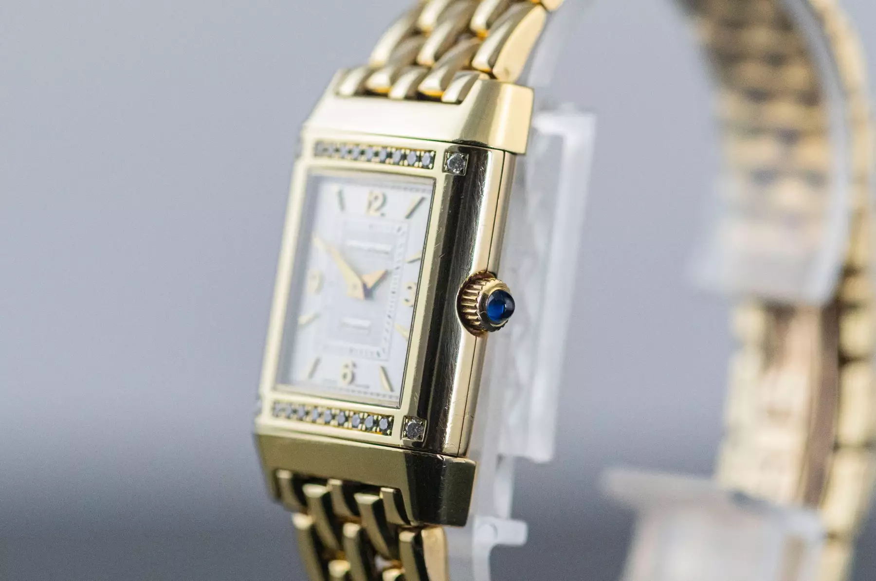 Since its launch in 1931, the JLC Reverso has had a reversible case that can be swivelled through 180°. The dimensions of the watch are 21 x 33 mm, making it a beautiful ladies' size. The watch has the original JLC gold bracelet with double folding clasp in 18k yellow gold, the weight of the watch is 107.1 grams.