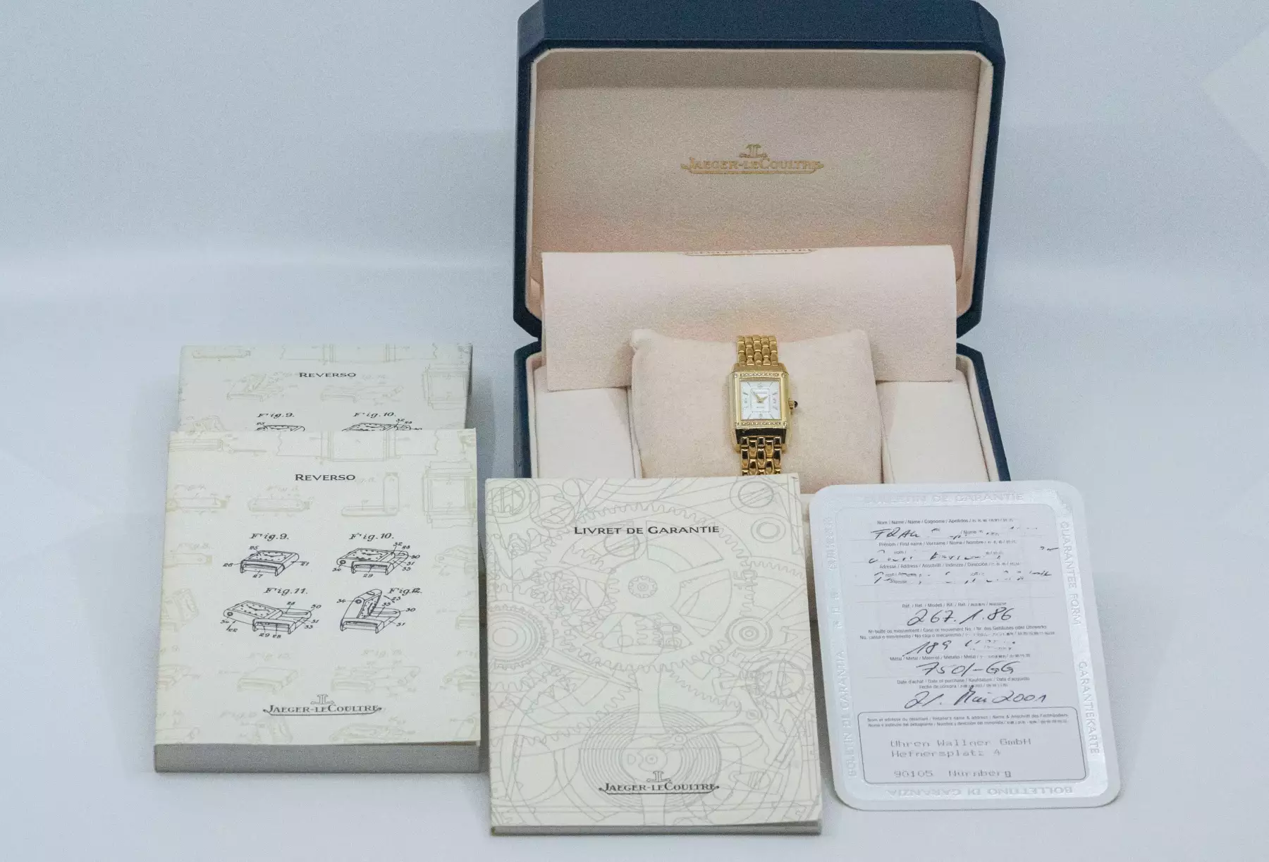 This Reverso Joaillerie is in a good and unpolished condition and comes in a full set with the original JLC box - Livret de Garantie - Garantie certificate (German delivery - sold in May 2001) - Reverso description / booklet.