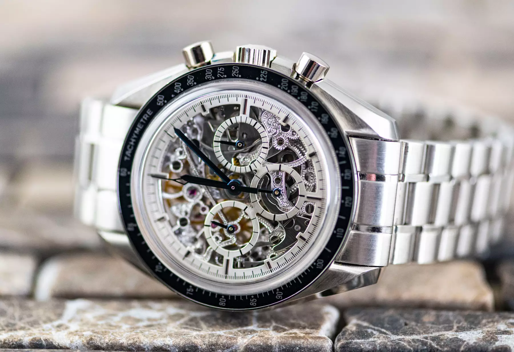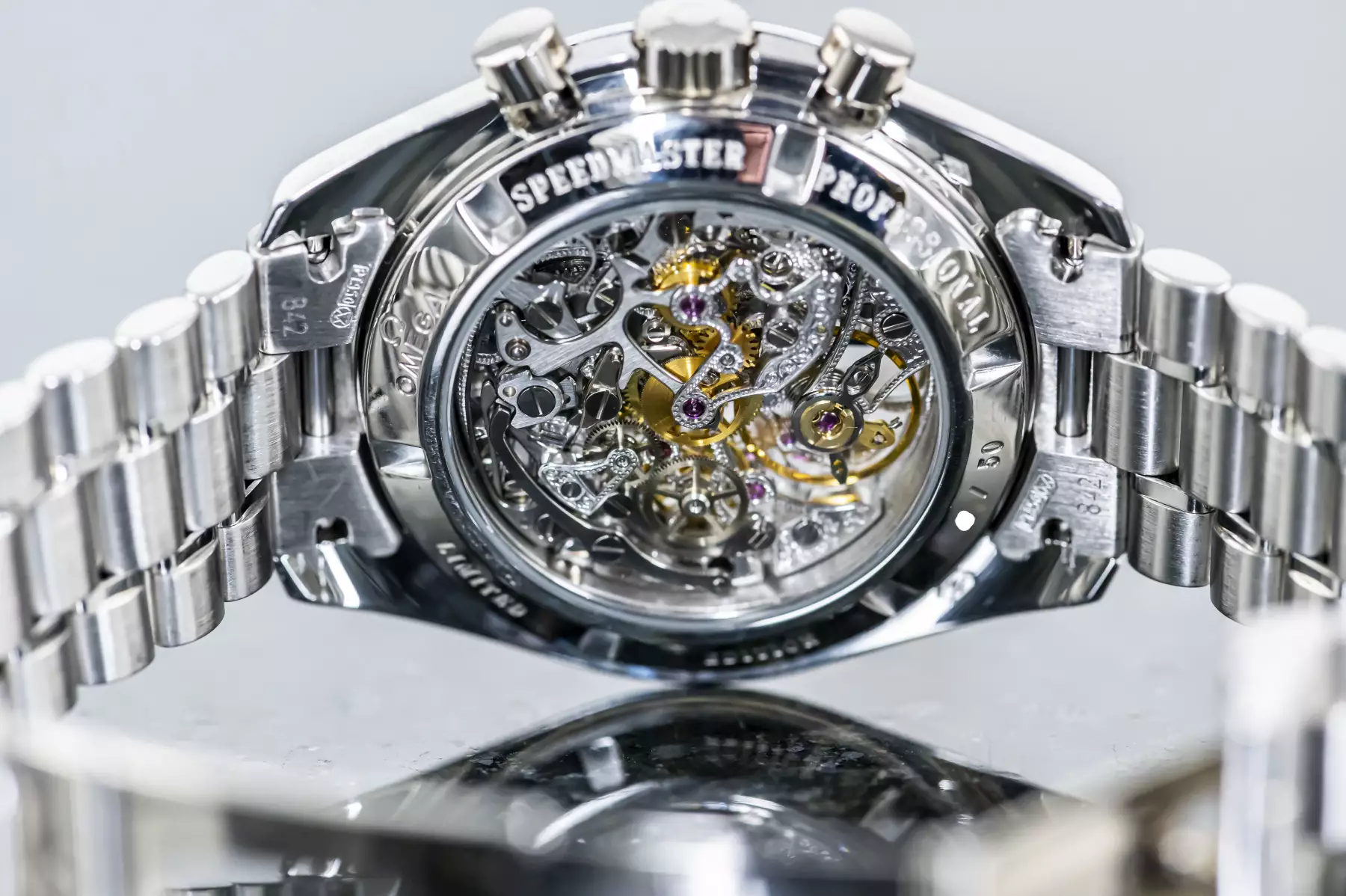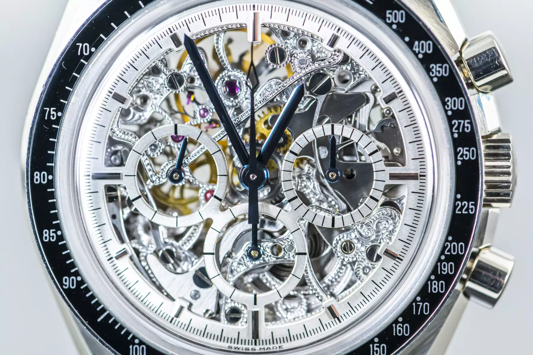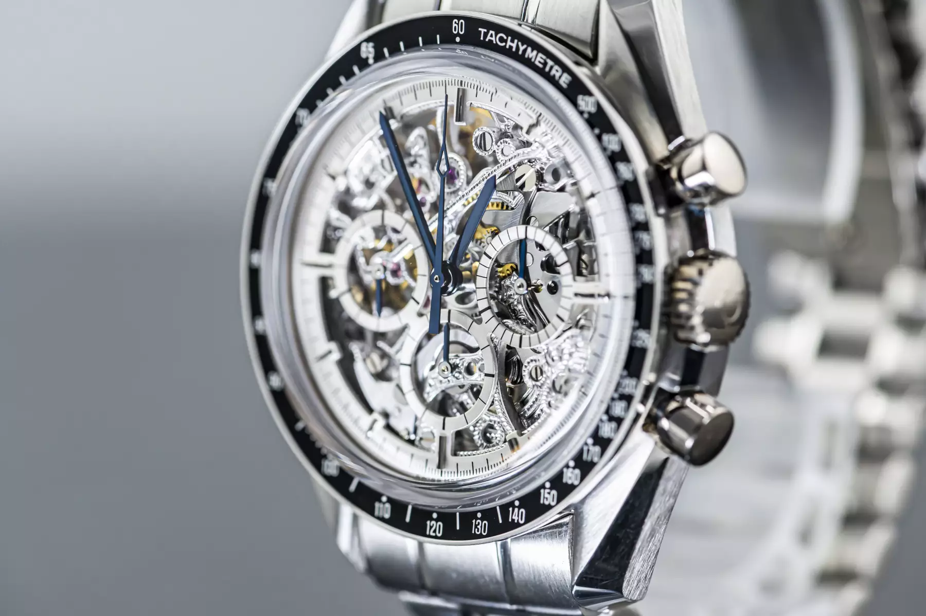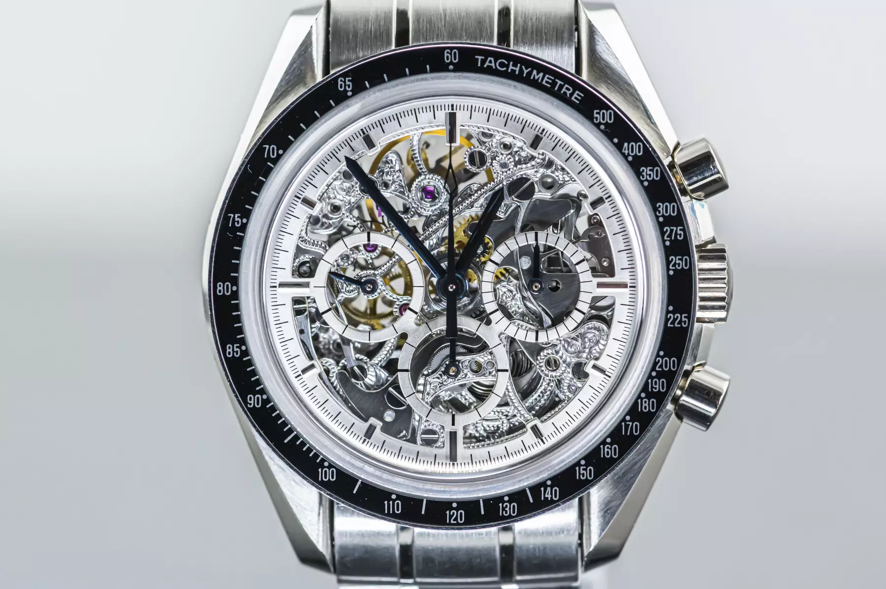 This masterpiece is powered by the Omega hand-wound caliber 867, which is the skeletonized version of the caliber 861. The stunning movement and "dial" are hand skeletonized and engraved by the legendary Armin Strom with a yellow gold finish. It also has the following functions: Hours - minutes - small seconds - chronograph. With a diameter of 42 mm, it has the classic size of a Speedy.