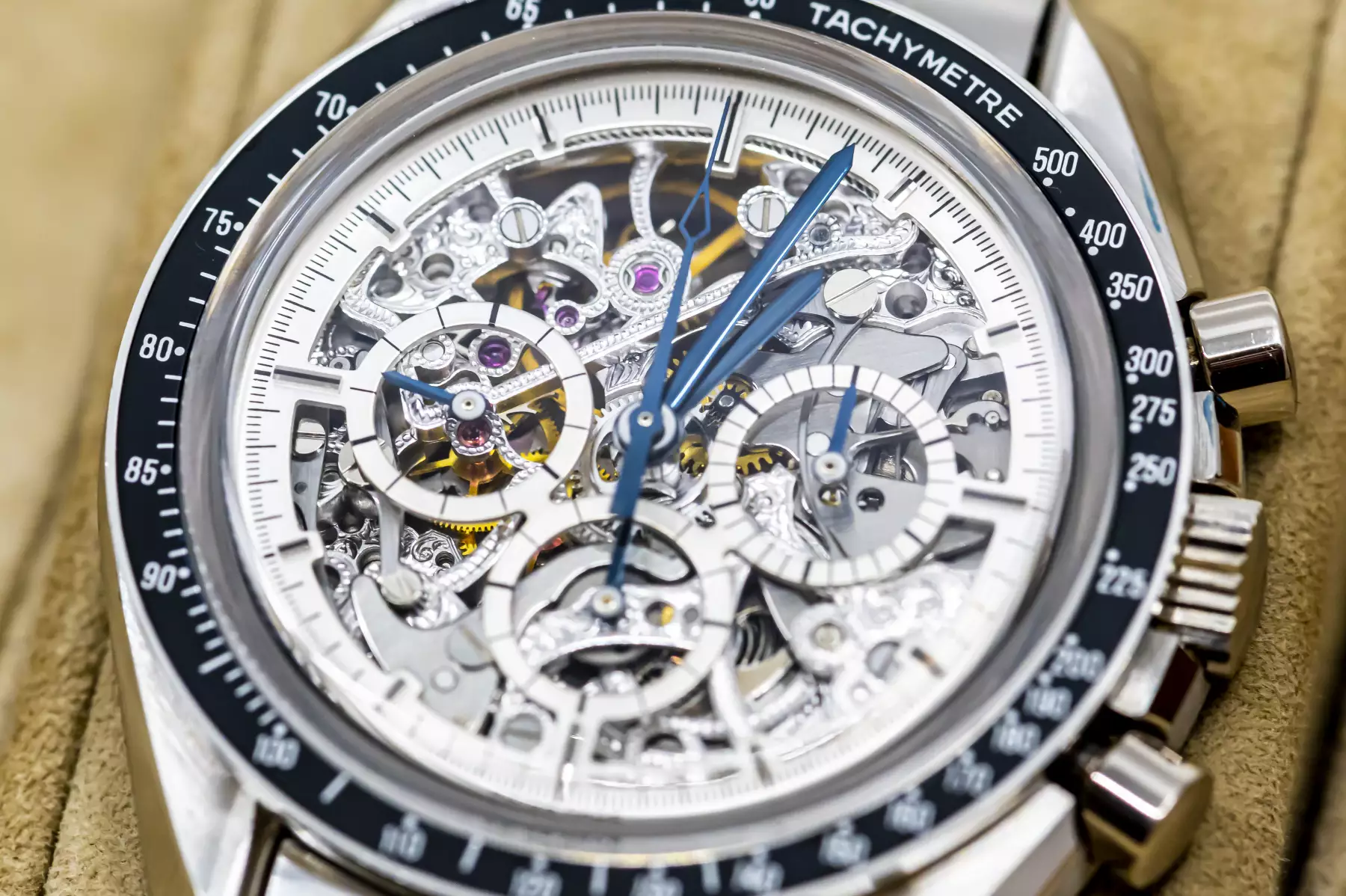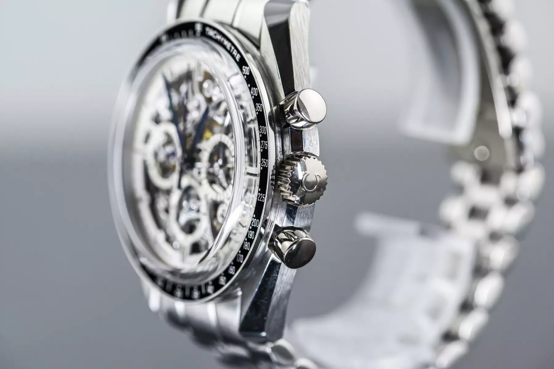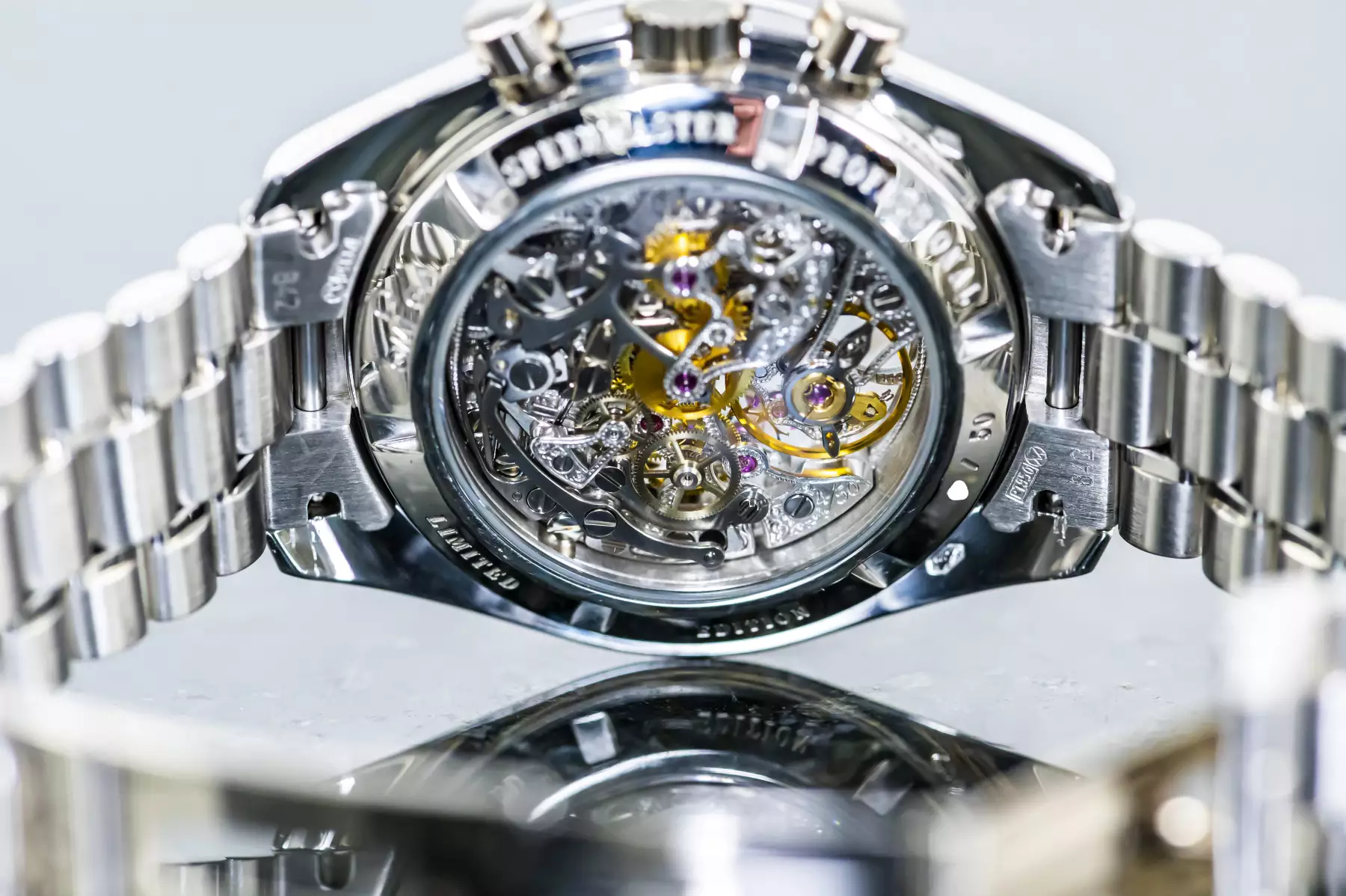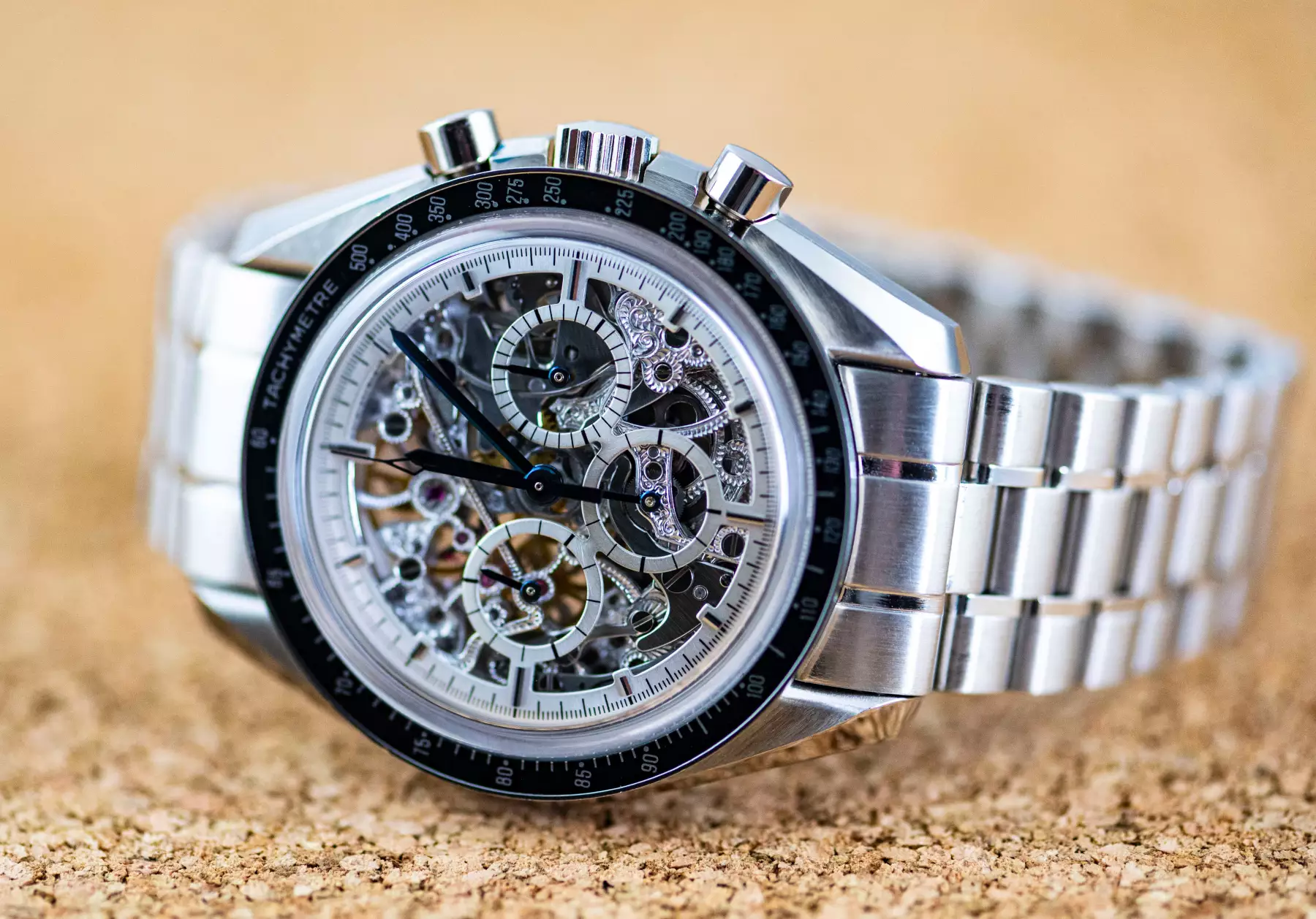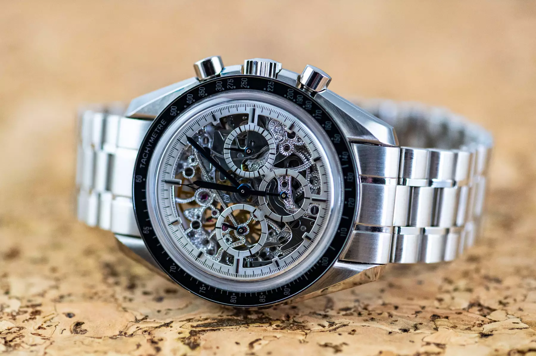 This masterpiece is powered by the Omega hand-wound caliber 867, which is the skeletonized version of the caliber 861. The stunning movement and "dial" are hand skeletonized and engraved by the legendary Armin Strom with a yellow gold finish. It also has the following functions: Hours - minutes - small seconds - chronograph. With a diameter of 42 mm, it has the classic size of a Speedy.