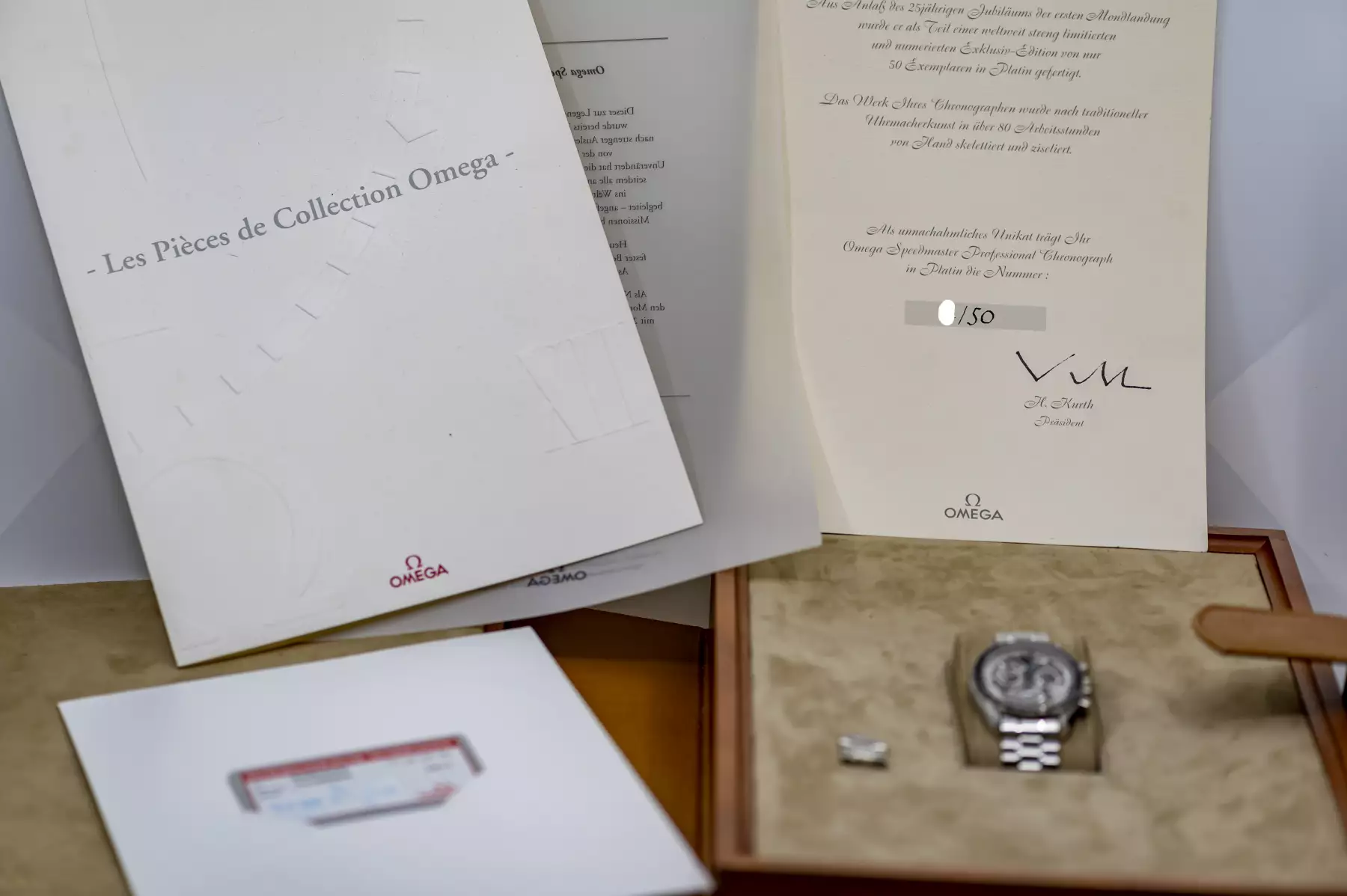 Very rare and extremely limited Omega Speedmaster Professional Chronograph with the reference number 30963 - AT345.0063 in 950 platinum with original Omega platinum bracelet Apollo XI 1969 - 1994.