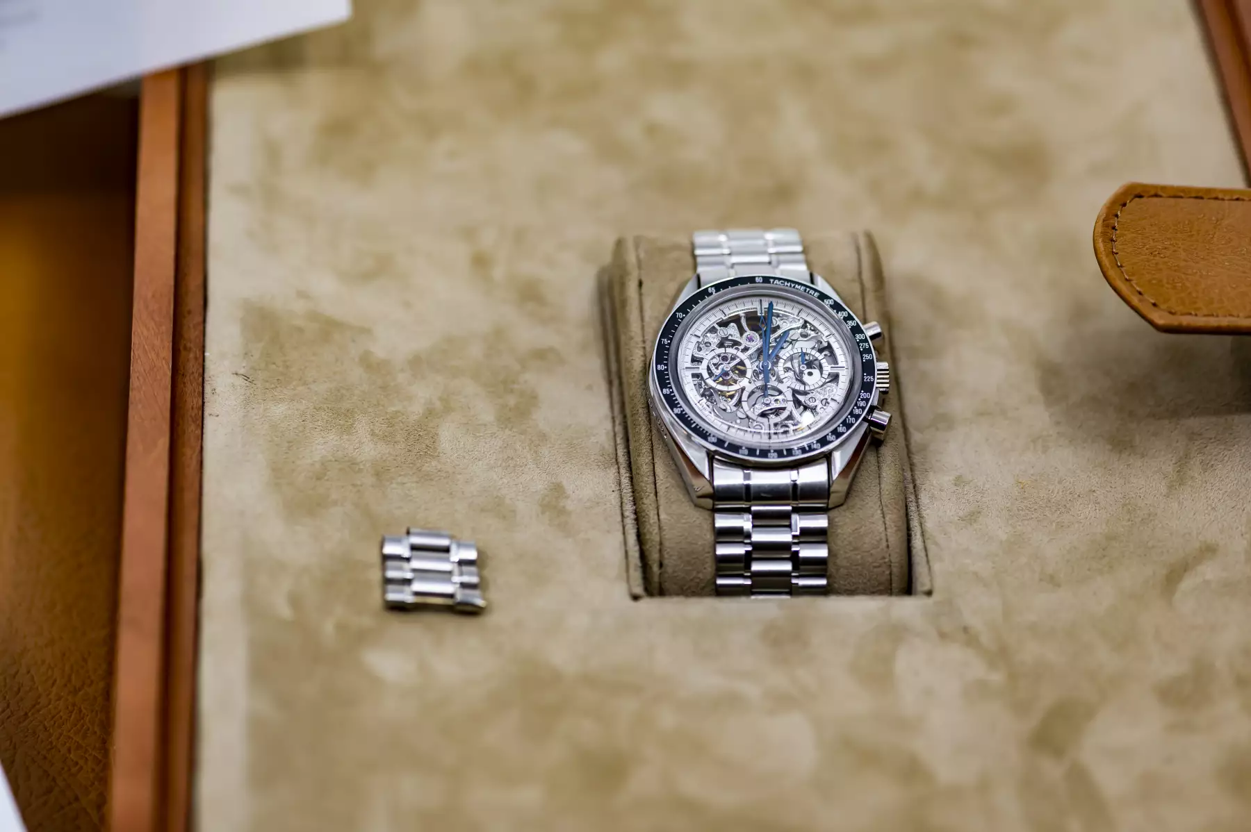 With a total weight of approx. 237 grams, you are sure to feel the Speedmaster on your wrist every second and fall in love with it every time you look at it. It is in very good condition, even the platinum bracelet shows almost no loss of tension and has only minor signs of wear.