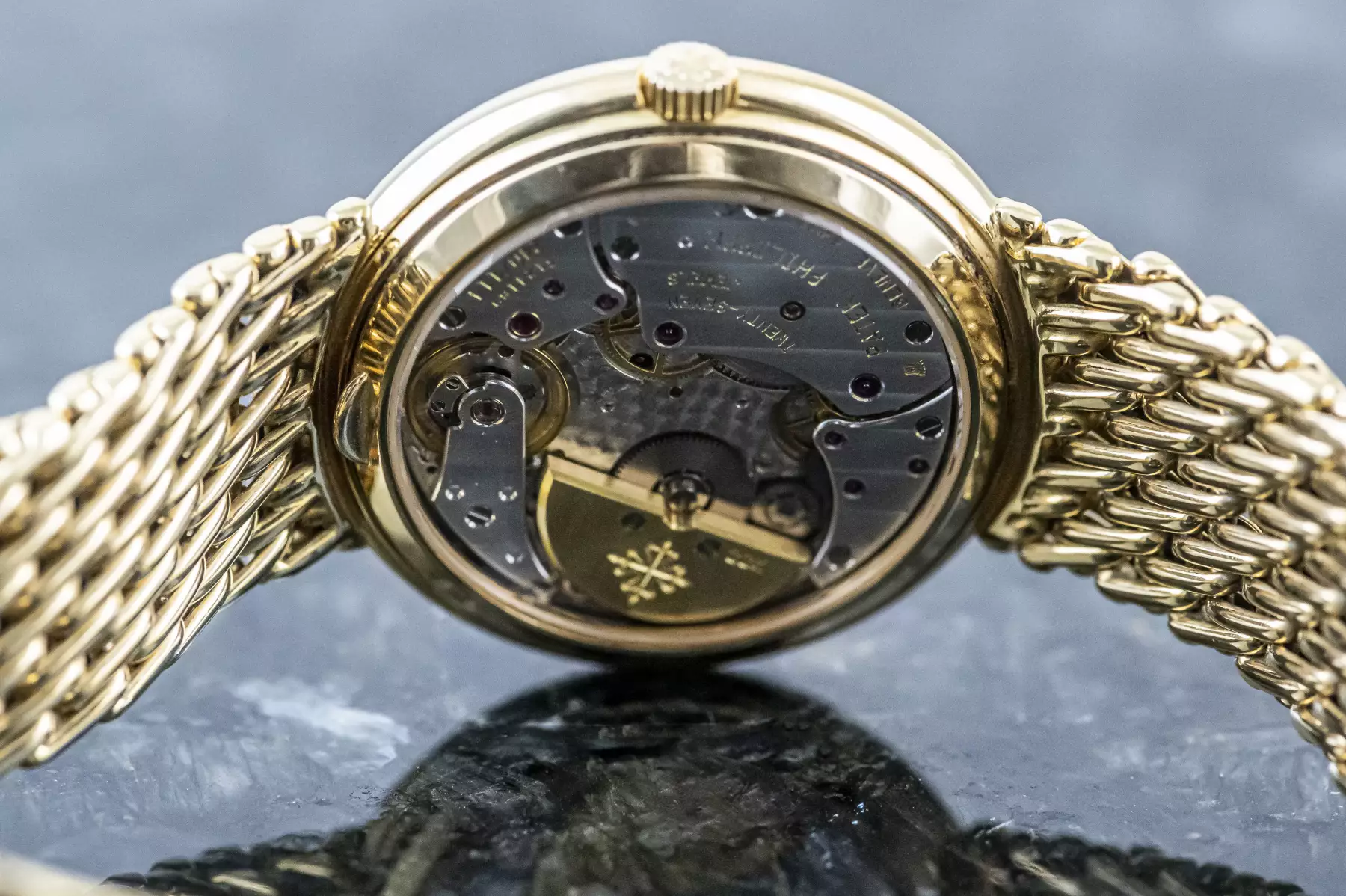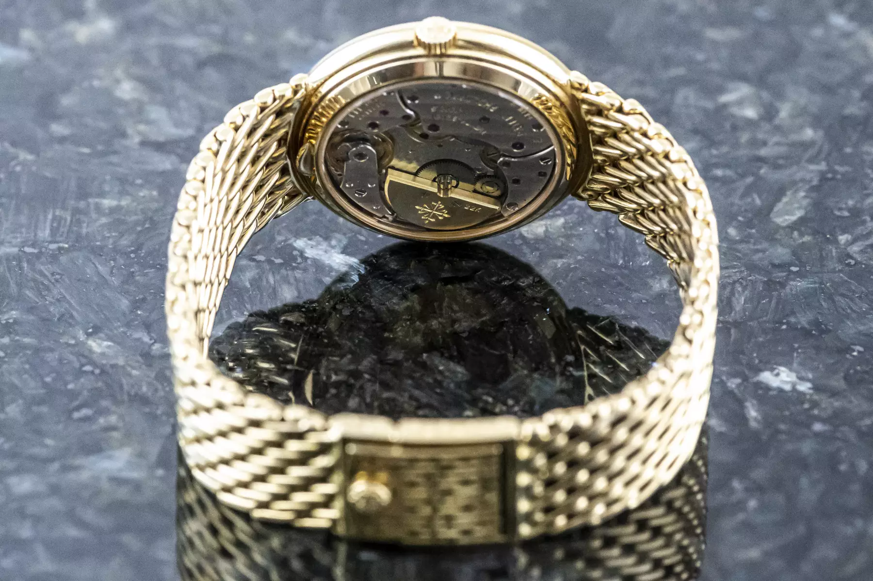 The Patek Philippe automatic caliber 240Q can be seen through the glass back, which has the following functions: hours - minutes - perpetual calendar: date - day of the week - month - moon phases - leap years - 24-hour display.