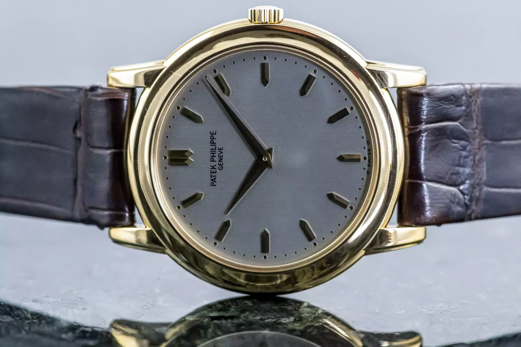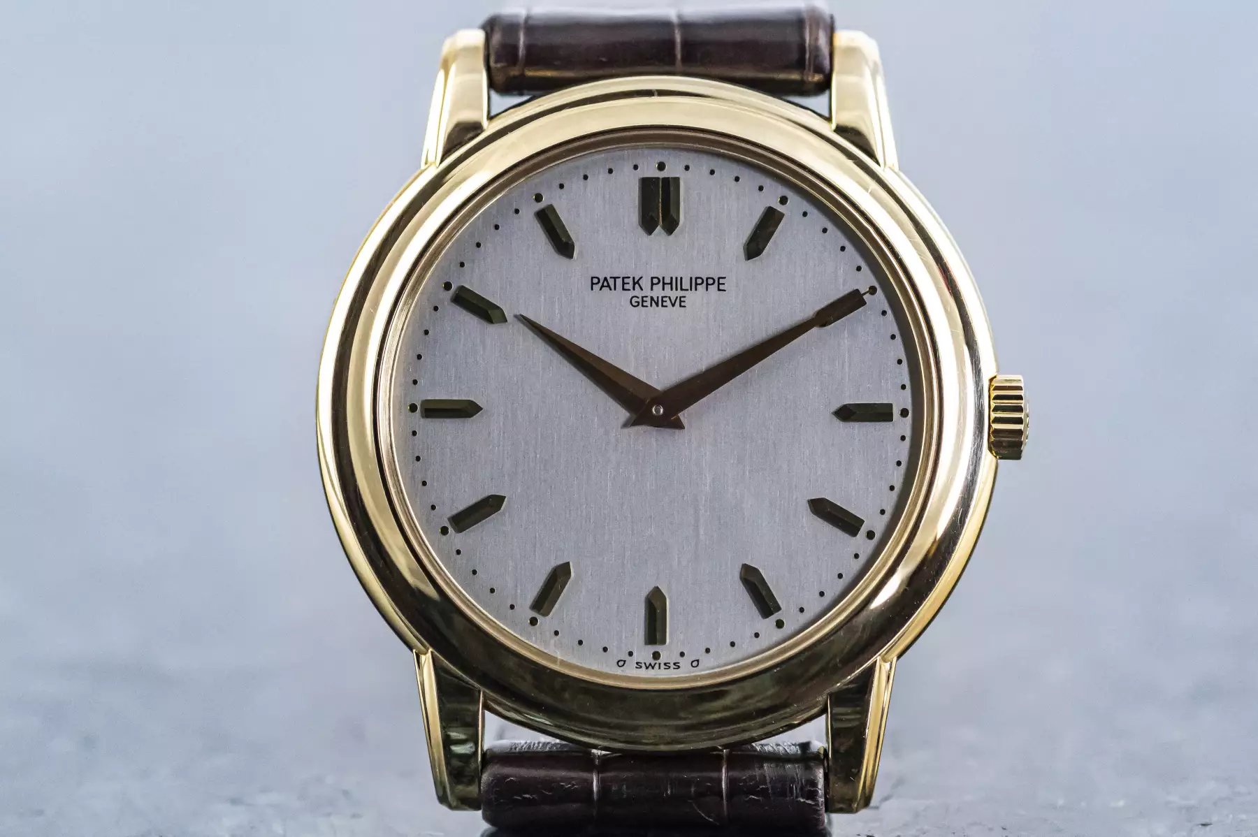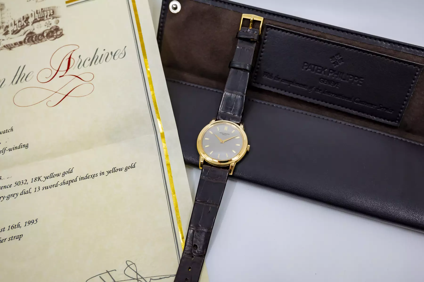 Stunning Patek Philippe Calatrava with the reference 5032J in 18k yellow gold. Beautiful silver-grey dial with 13 sword-shaped indices in yellow gold! Underneath is the Patek automatic caliber 240. This Patek is on a leather strap with original Patek buckle in 18k yellow gold and is in very good condition.