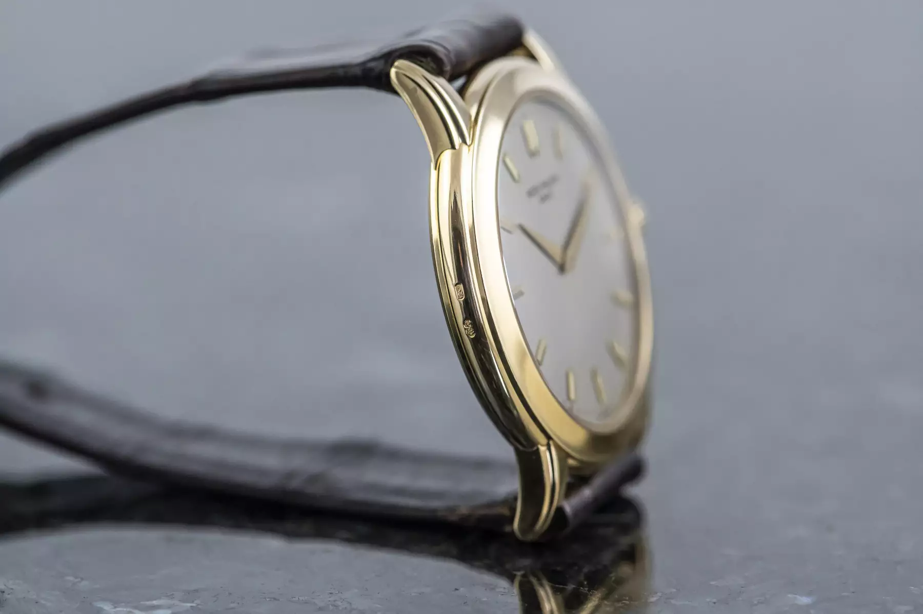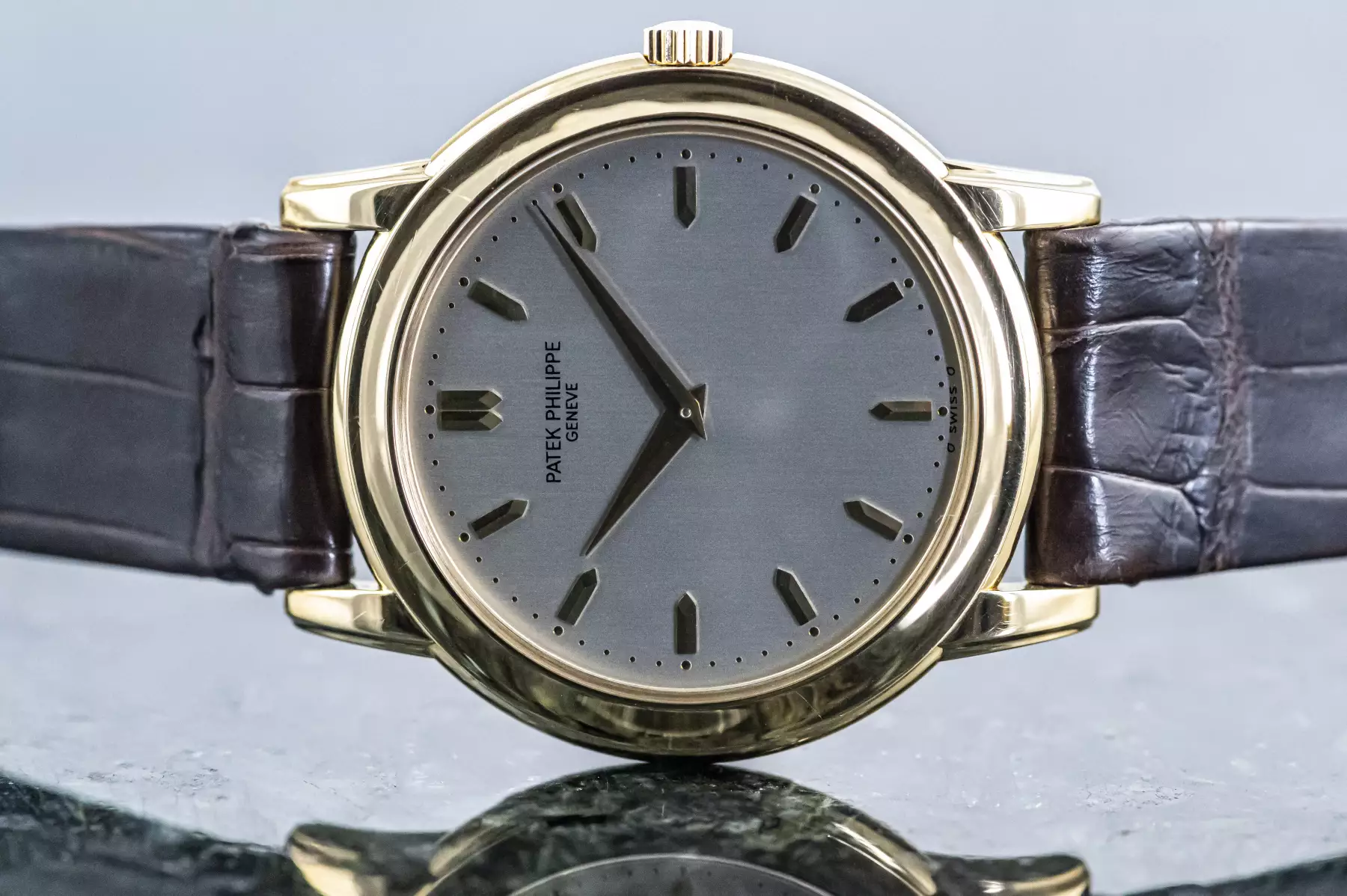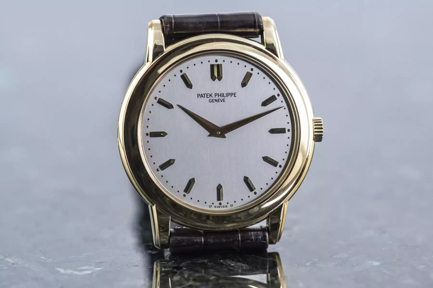 Stunning Patek Philippe Calatrava with the reference 5032J in 18k yellow gold. Beautiful silver-grey dial with 13 sword-shaped indices in yellow gold! Underneath is the Patek automatic caliber 240. This Patek is on a leather strap with original Patek buckle in 18k yellow gold and is in very good condition.
