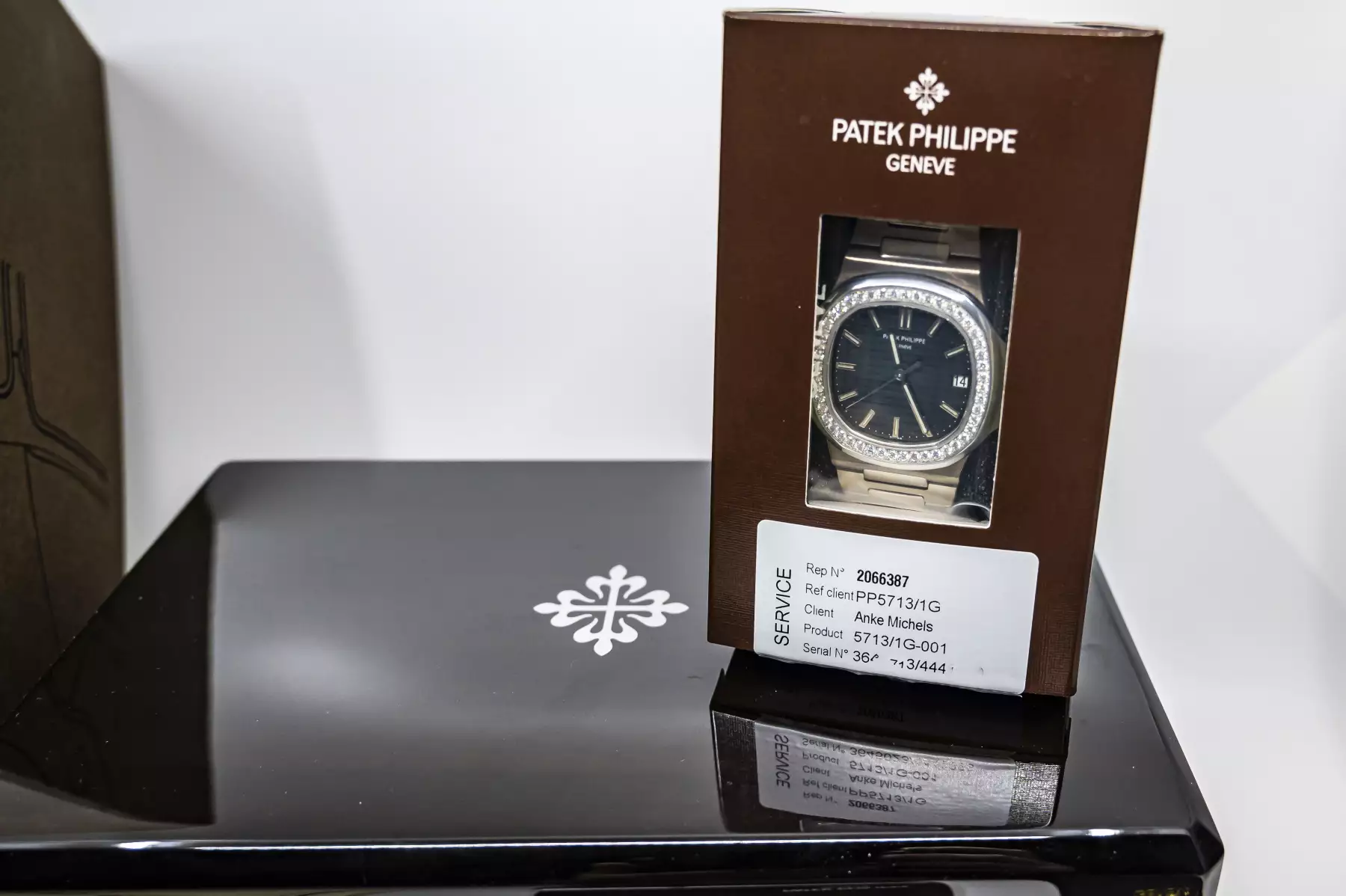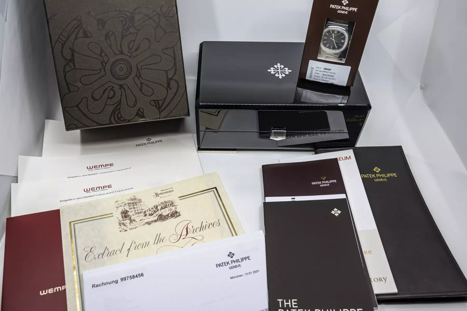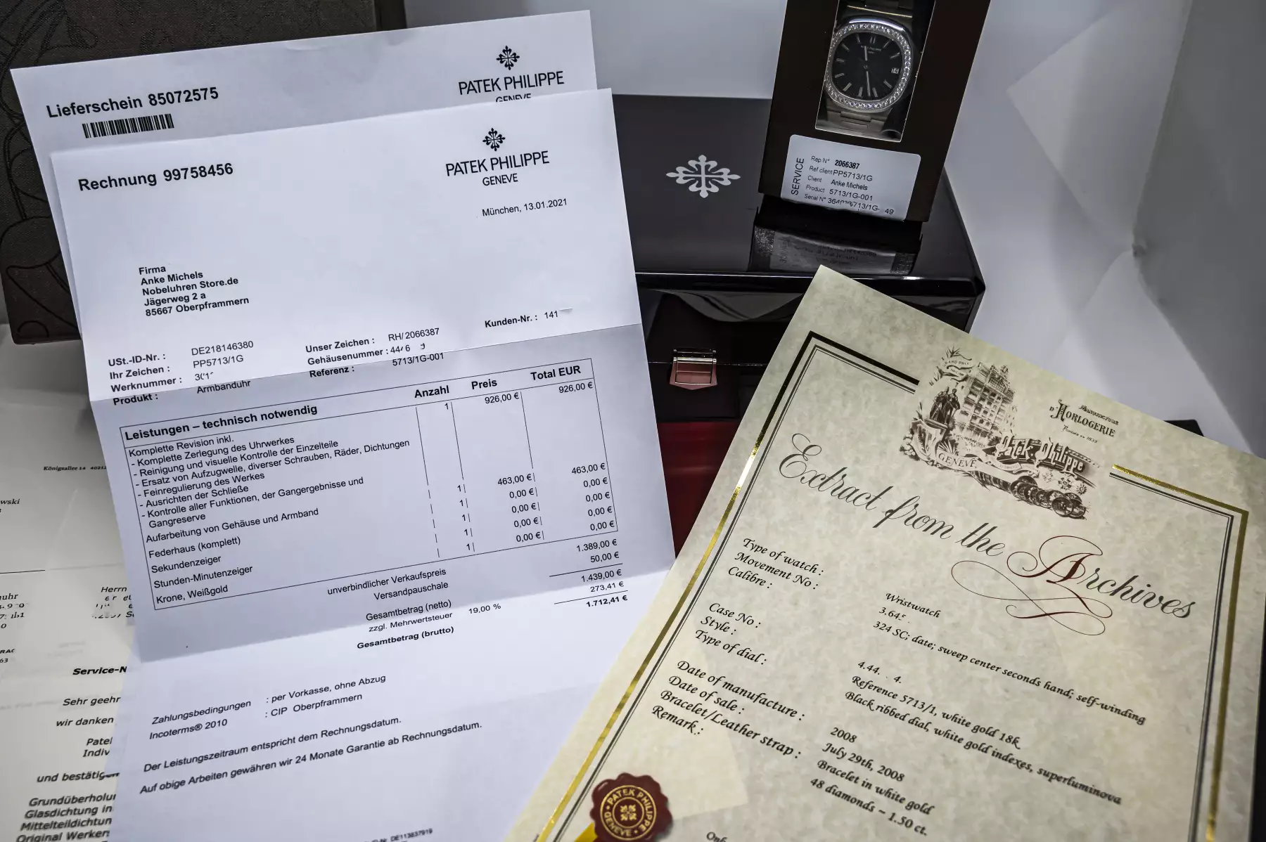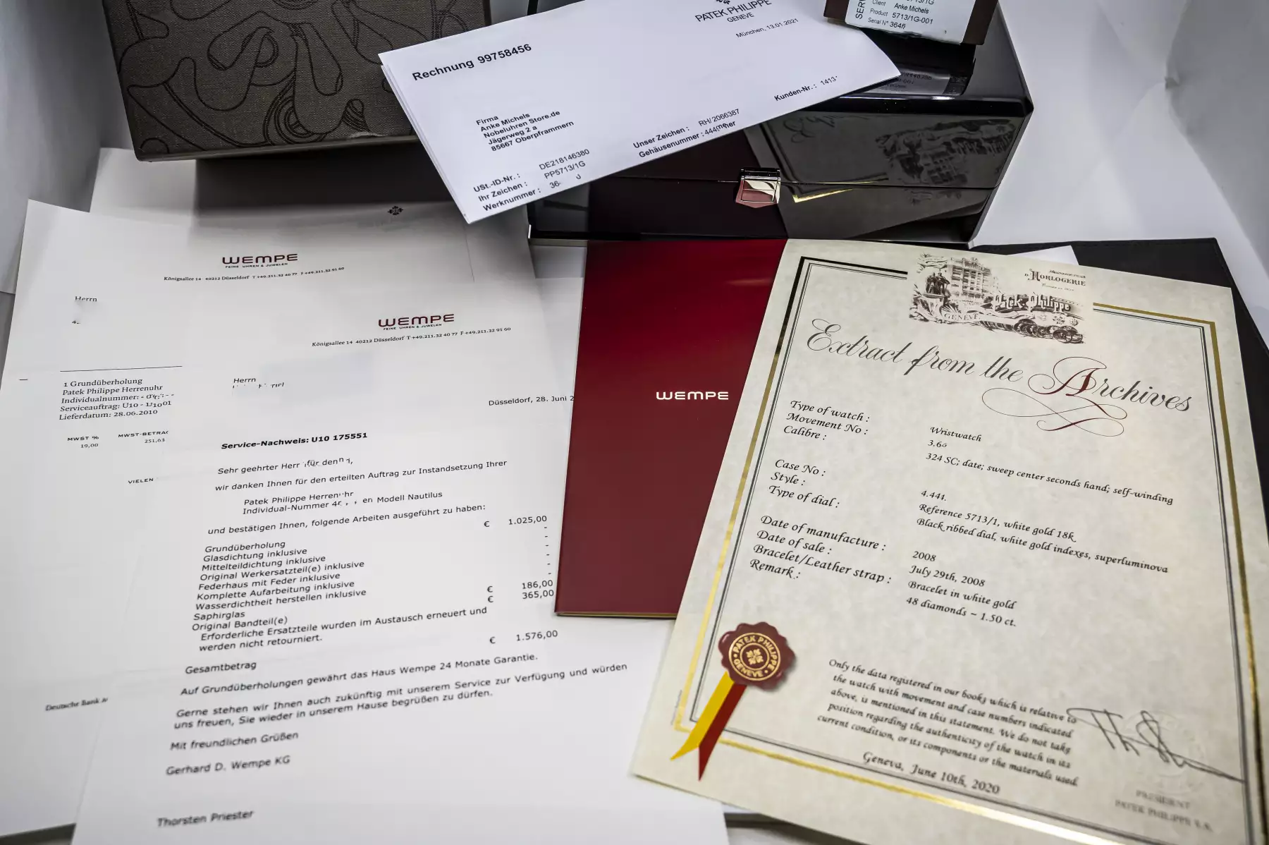 This beauty was produced in 2008 and sold on July 29, 2008, after a service in January 2021 by Patek Philippe, the watch is in unworn condition / sealed. This Patek comes on a white gold bracelet with double folding clasp and the PP automatic caliber 324 SC with date & center seconds. Not only the 5713G is amazing, also the set with PP box - leather folder - Extract from the Archives - booklets - Patek service box - Patek service invoice - Wempe service invoice.