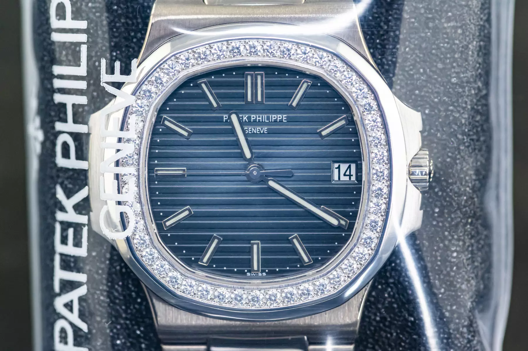 Stunning and rare Patek Philippe Jumbo Nautilus with the reference number 5713/1G-001 in 18k white gold and with diamond bezel including 48 diamonds with a total of approx. 1.50 carats.