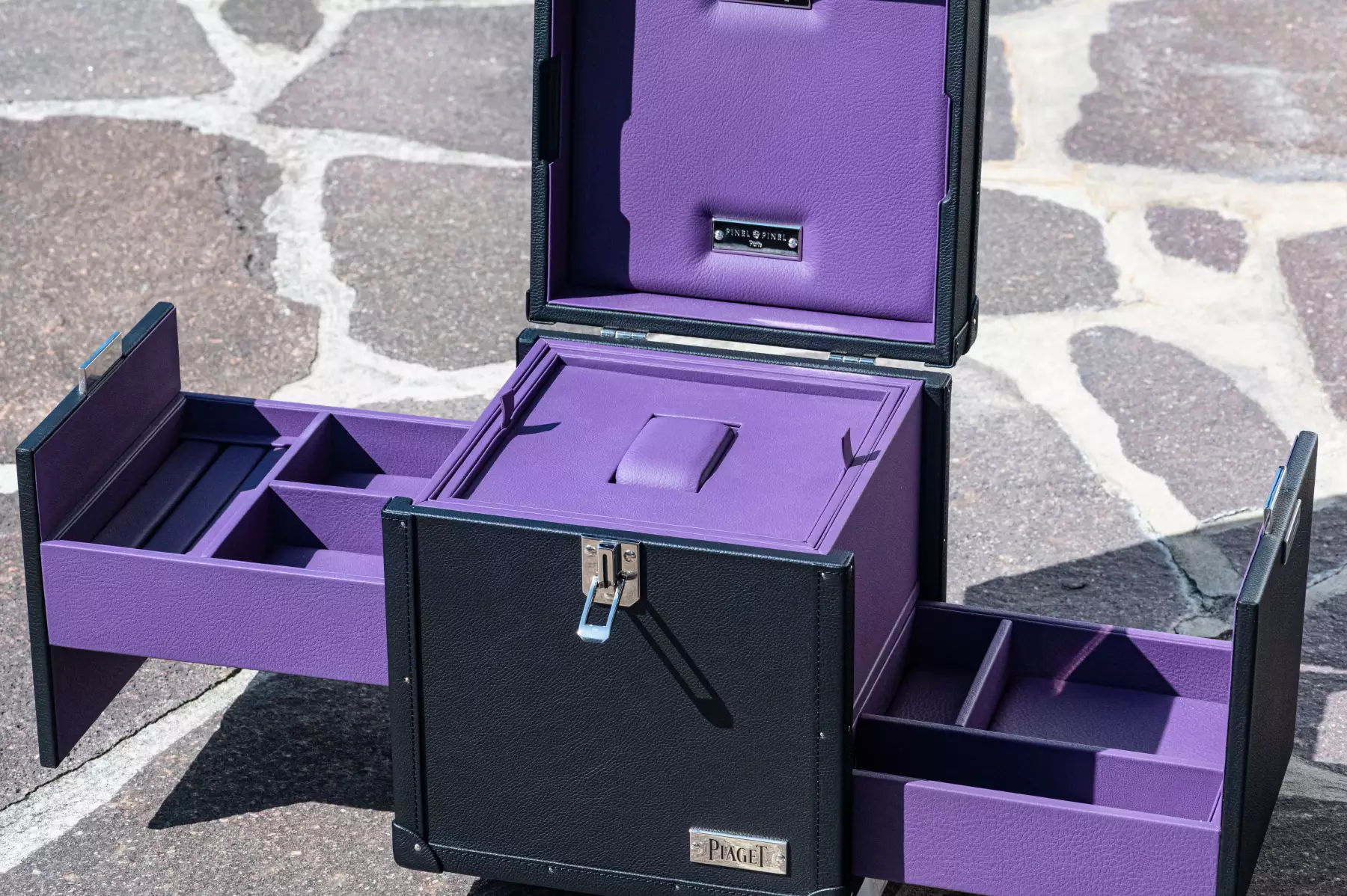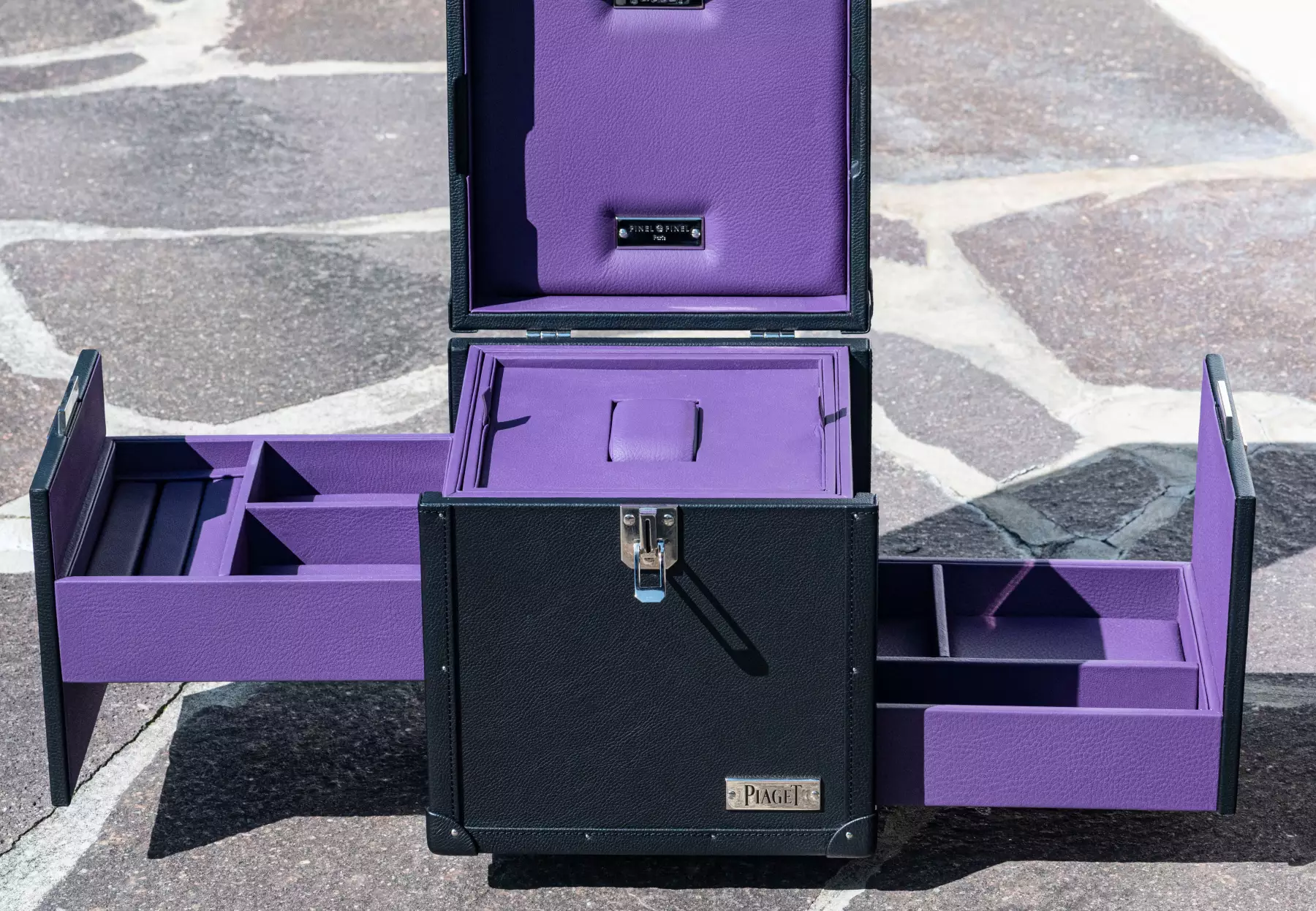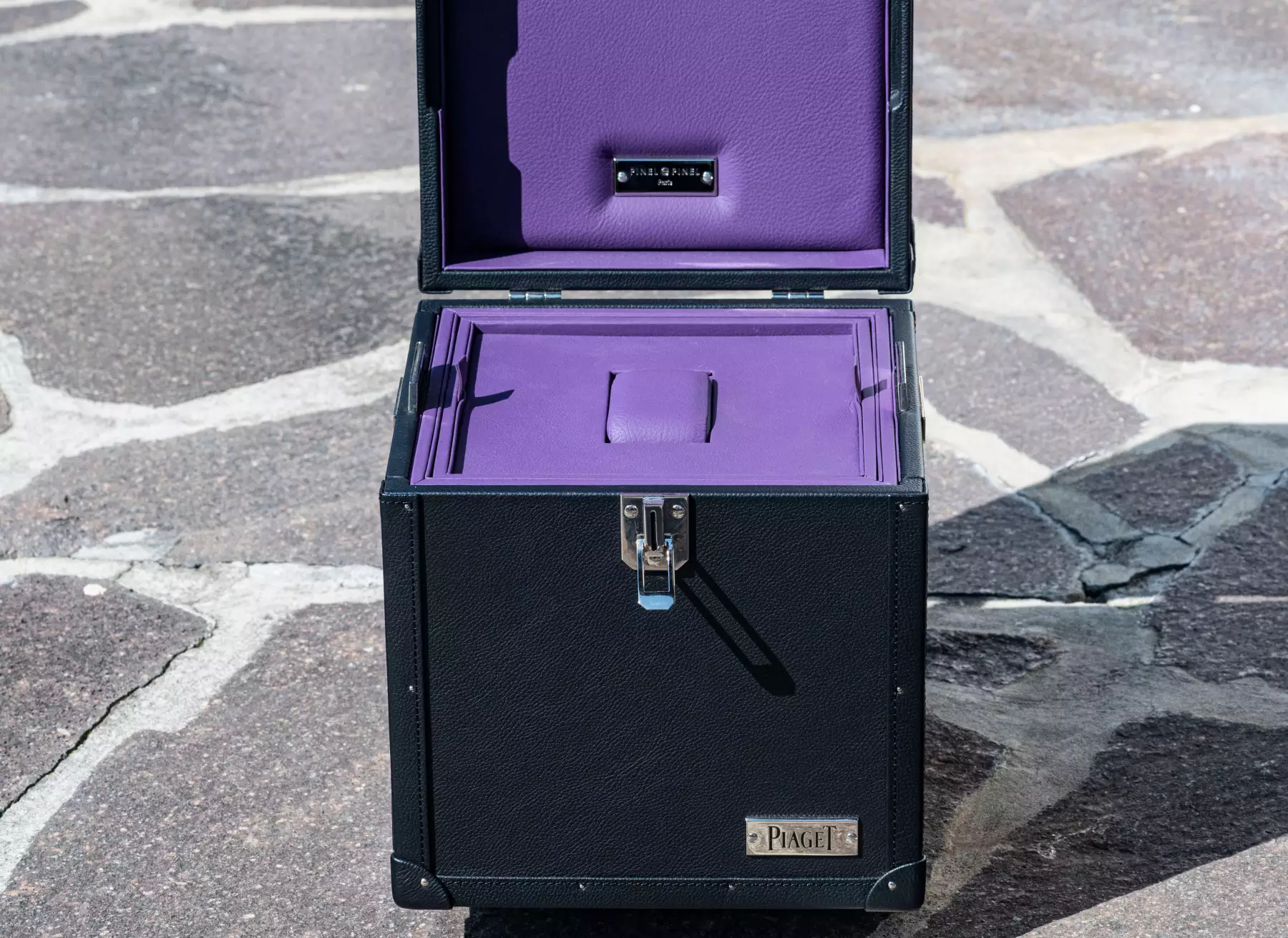 Extremely rare Piaget suitcase by Pinel & Pinel made of high-quality leather and elaborately finished. This suitcase is a special production for Piaget itself, the original price for a presentation case like the one shown is today between €10,500 and €12,500 excluding tax. The dimensions are: height 26 cm x width 23.5 cm, with a total weight of over 4 kg. The condition of the suitcase is very good to as good as new, as it was only used once for an exhibition. The inside of the suitcase is made of the finest aubergine-coloured leather and is just as perfectly finished as the rest of the suitcase. Two drawers for jewellery (rings, necklaces, bracelets, etc.) can be opened on the right and left of the case. As Frederic Pinel himself says, every piece of Pinel & Pinel jewellery is ‘a work of jewellery craftsmanship that embodies the highest level of skill and precision. From the drawing of the prototype to the completion of a finished product, up to 1,300 hours of work are required.’ This suitcase is perfect for the finest Piaget jewellery and a rare Piaget watch, such as the extremely rare Piaget Vintage Polo that we are currently offering! The exclusivity and rarity of the Polo and the case are a perfect match and can be purchased together on request. Our Price includes 19% VAT! This item is directly available.