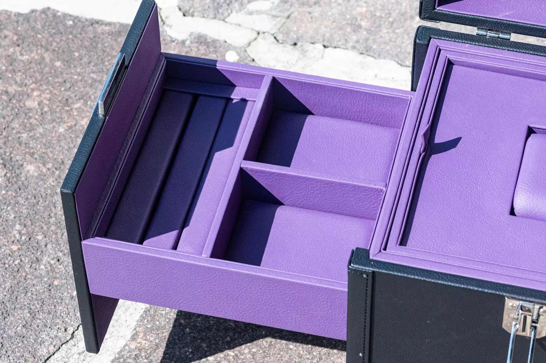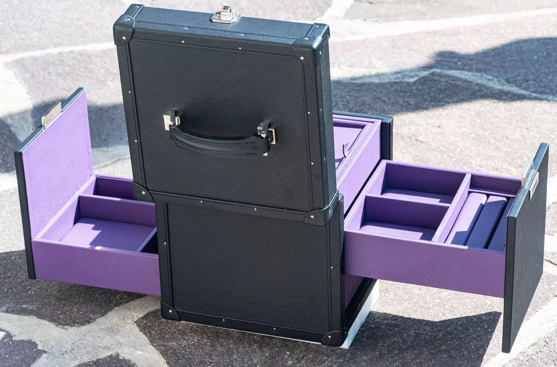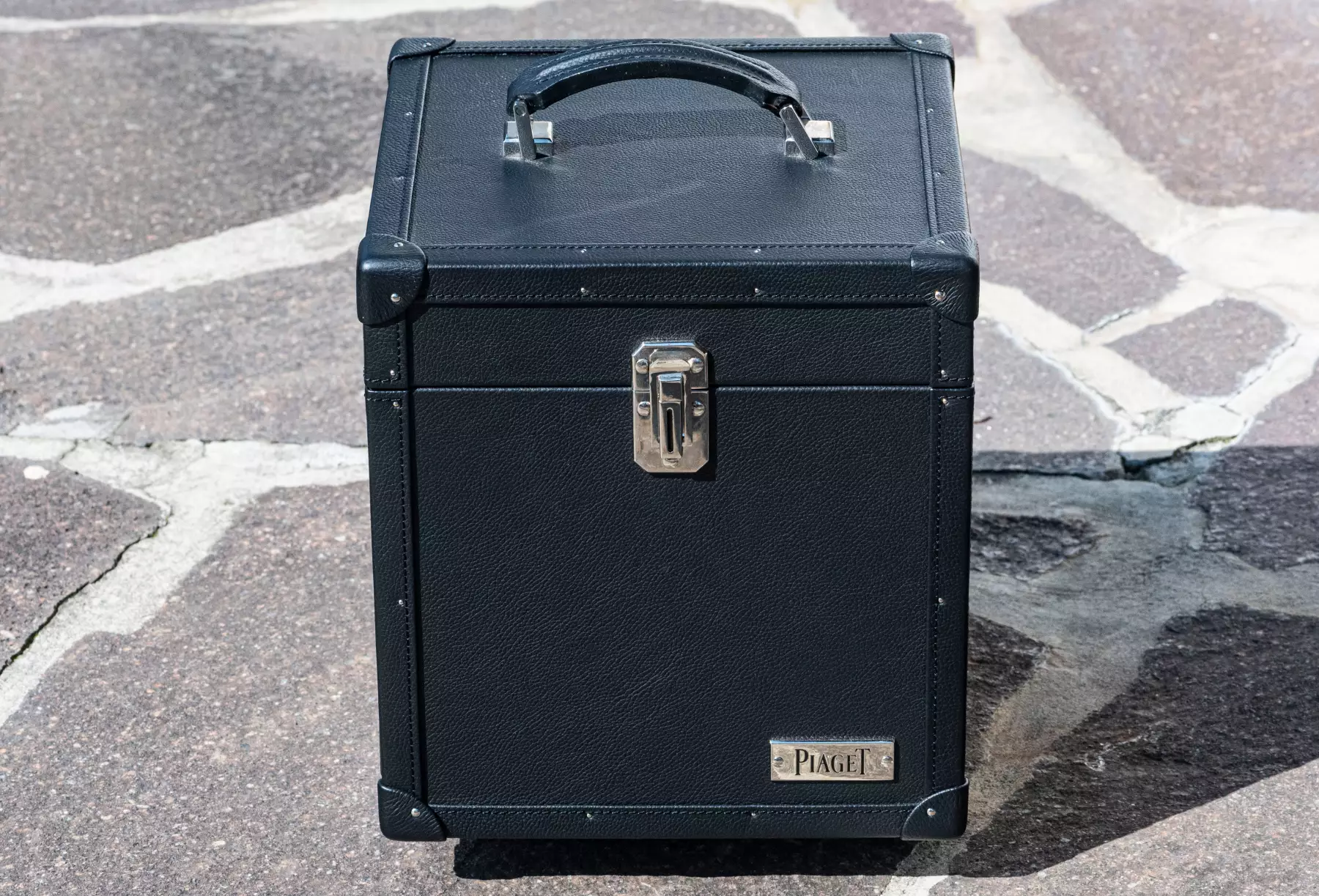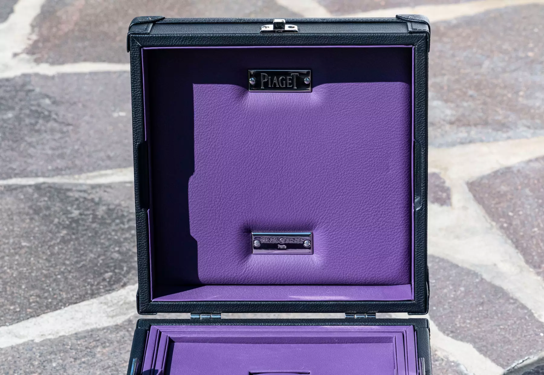 Extremely rare Piaget suitcase by Pinel & Pinel made of high-quality leather and elaborately finished. This suitcase is a special production for Piaget itself, the original price for a presentation case like the one shown is today between €10,500 and €12,500 excluding tax. The dimensions are: height 26 cm x width 23.5 cm, with a total weight of over 4 kg. The condition of the suitcase is very good to as good as new, as it was only used once for an exhibition. The inside of the suitcase is made of the finest aubergine-coloured leather and is just as perfectly finished as the rest of the suitcase. Two drawers for jewellery (rings, necklaces, bracelets, etc.) can be opened on the right and left of the case. As Frederic Pinel himself says, every piece of Pinel & Pinel jewellery is ‘a work of jewellery craftsmanship that embodies the highest level of skill and precision. From the drawing of the prototype to the completion of a finished product, up to 1,300 hours of work are required.’ This suitcase is perfect for the finest Piaget jewellery and a rare Piaget watch, such as the extremely rare Piaget Vintage Polo that we are currently offering! The exclusivity and rarity of the Polo and the case are a perfect match and can be purchased together on request. Our Price includes 19% VAT! This item is directly available.