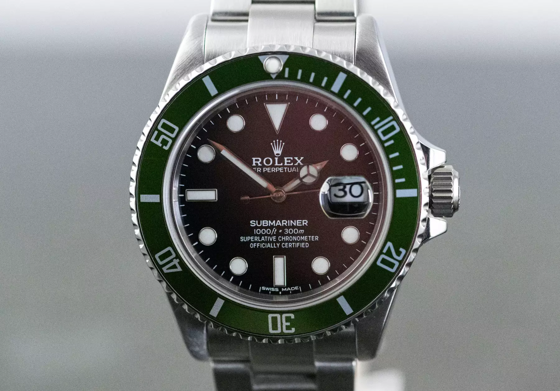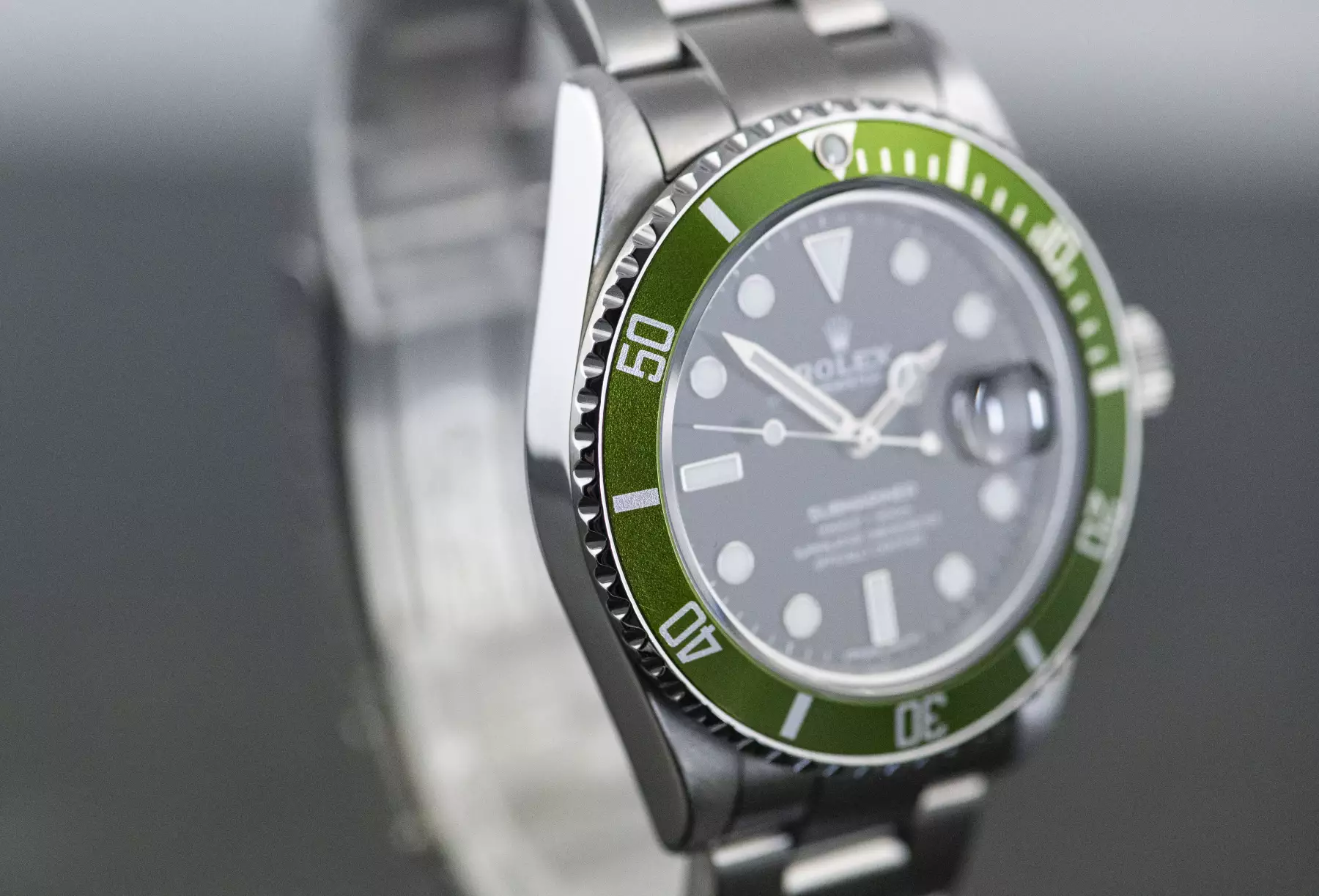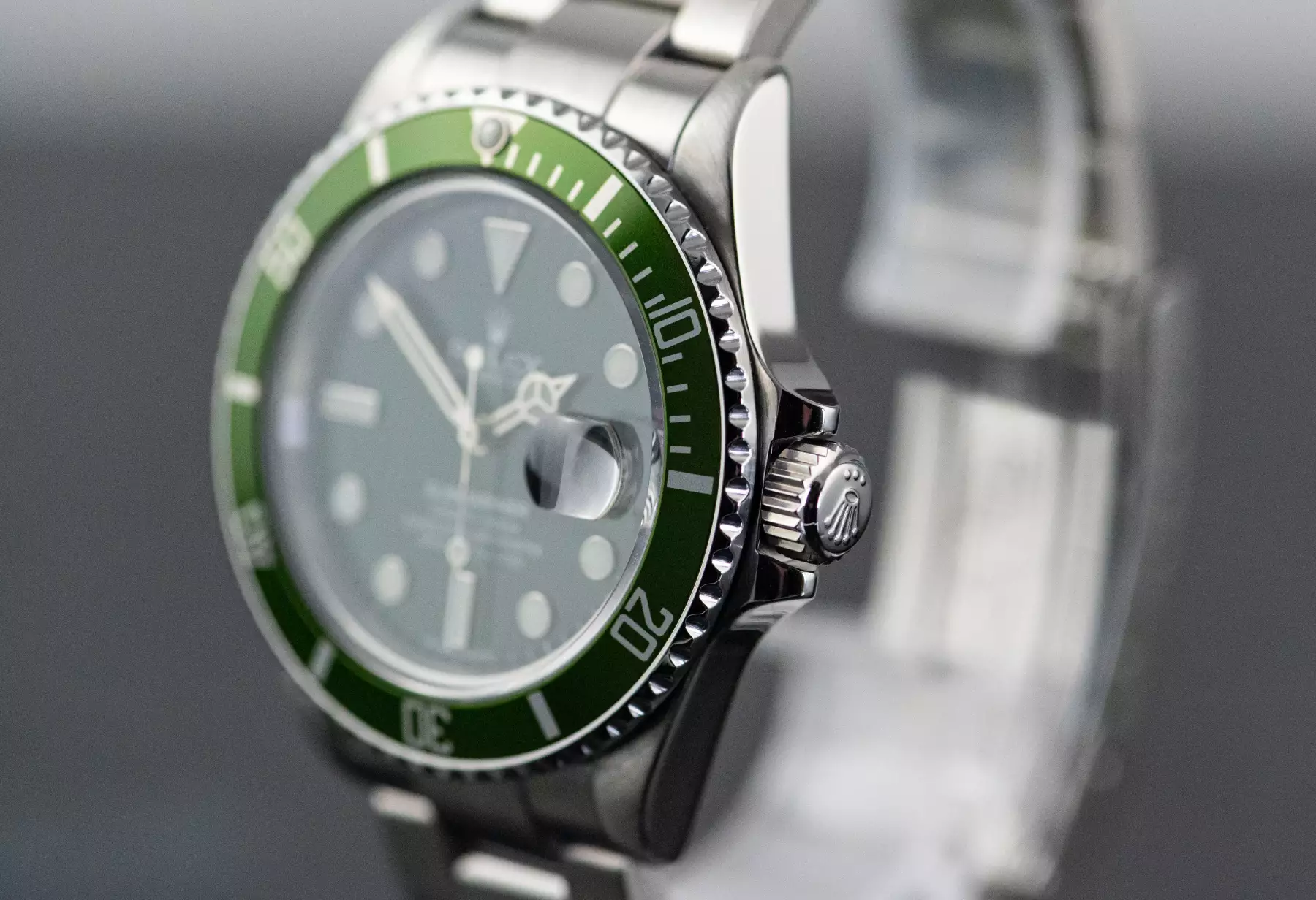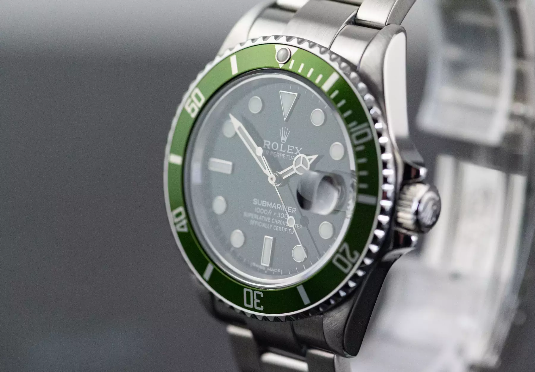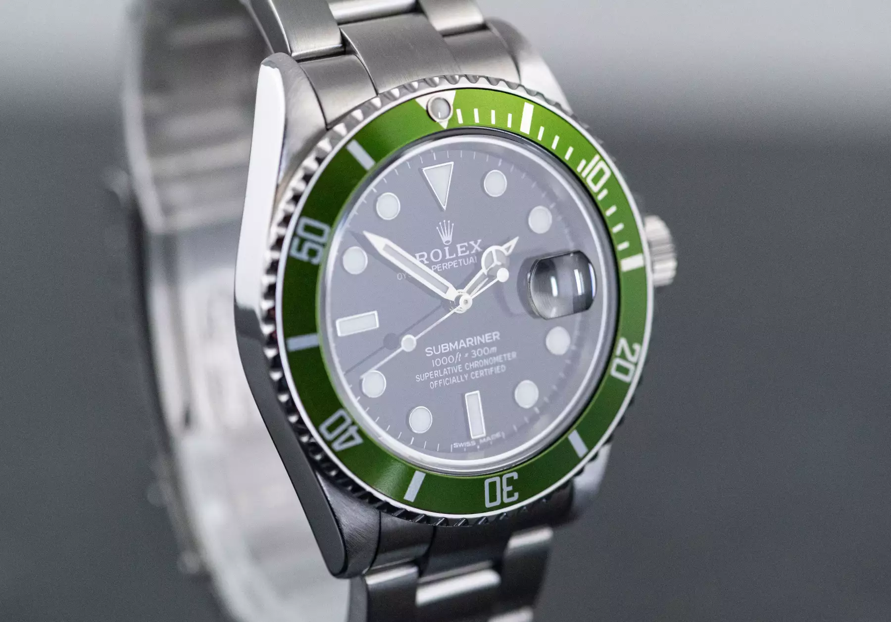 Rolex Submariner Date ‘Kermit’ with the reference 16610 in steel from 2004. The watch is in good, worn condition and is on the original Rolex Oyster steel bracelet with folding clasp. This Submariner comes in a great full set with the original Rolex box with outer box - guarantee certificate (sold on 22/05/2004 - LC200) - white sales tag / hangtag - booklets - folder - chronometer hangtag - dismantled element. This item is directly available. The sale of this Watch is subject to differential-taxation according to §25A UStG (Value Added Tax Act).